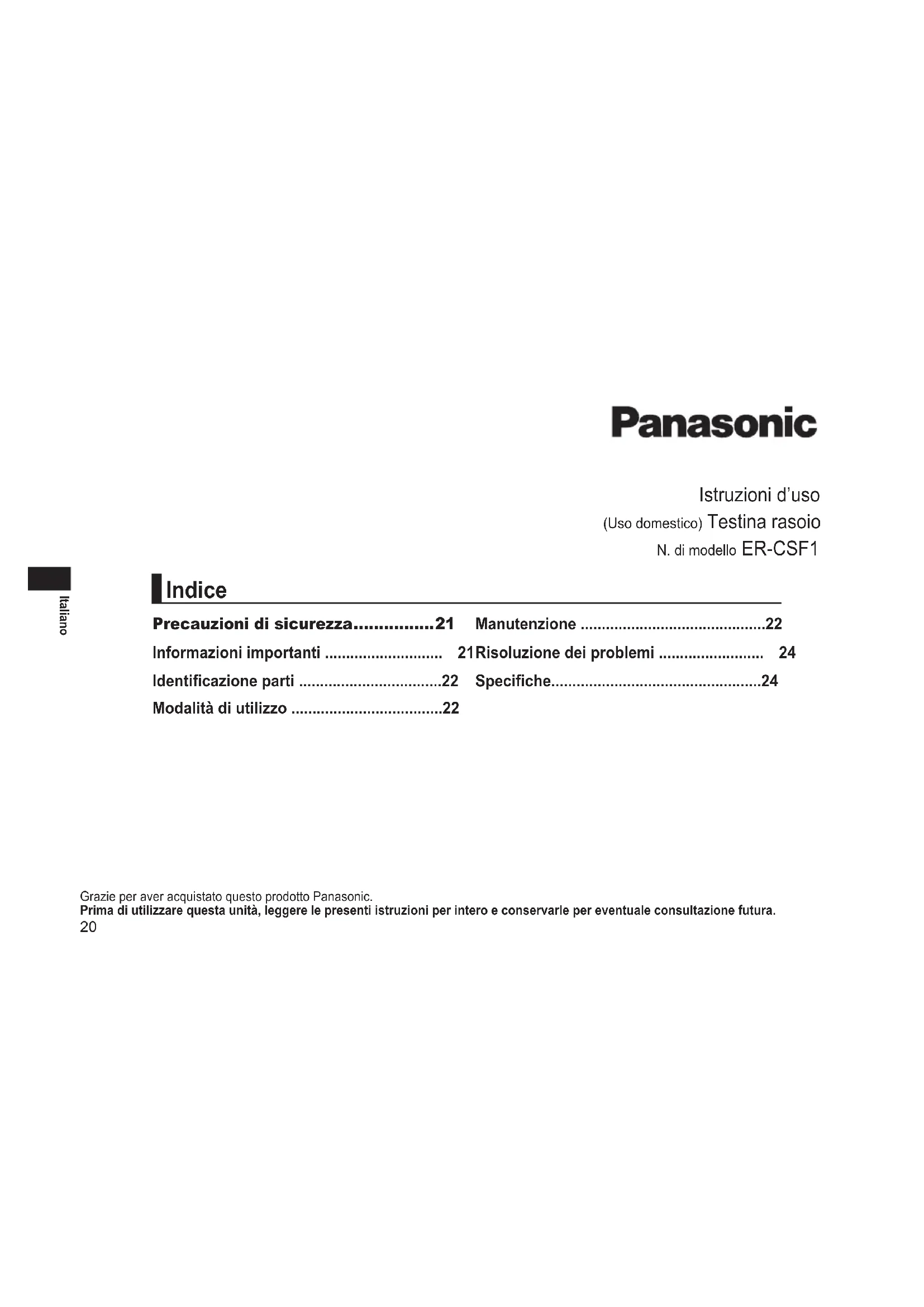 Scarica le istruzioni per il tuo Accessorio da barba in formato PDF gratuitamente! Trova il tuo manuale ERCSF1 - PANASONIC e riprendi in mano il tuo dispositivo elettronico. In questa pagina sono pubblicati tutti i documenti necessari per l'utilizzo del tuo dispositivo. ERCSF1 del marchio PANASONIC.