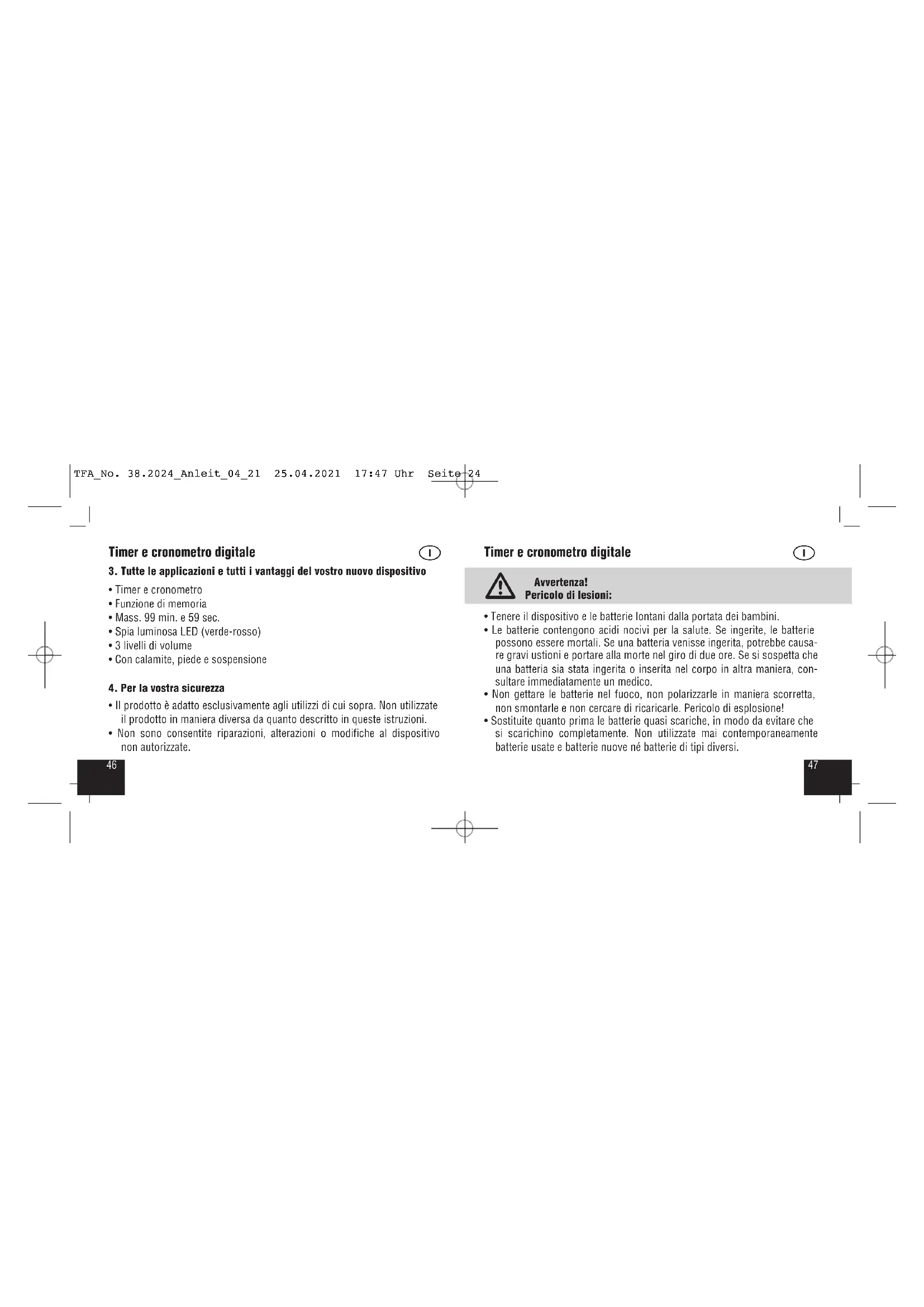 Questo prodotto è stato realizzato utilizzando materiali e componenti di alta qualità che possono essere riciclati e riutilizzati. È assolutamente vietato gettare le batterie e le batterie ricarica- bili tra i rifiuti domestici. TFA_No. 38.2024_Anleit_04_21 25.04.2021 17:47 Uhr Seite 285756 Timer e cronometro digitale