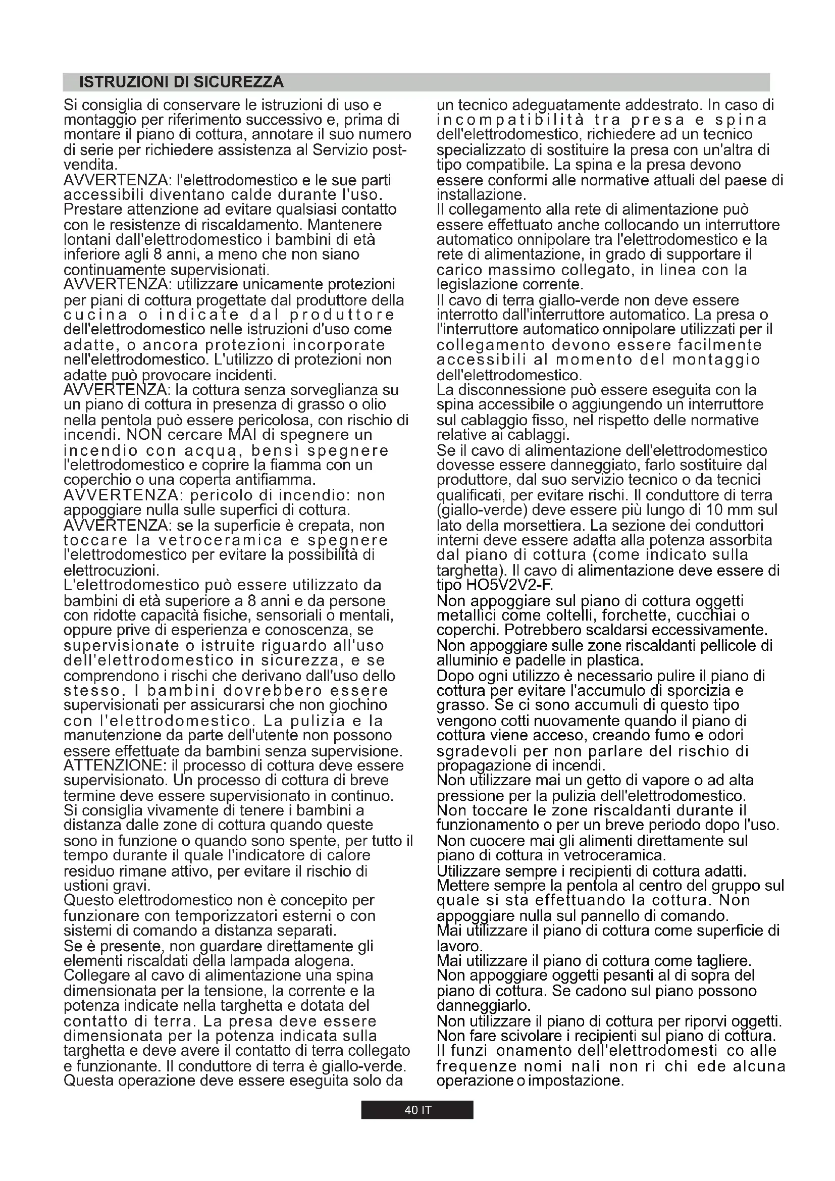 7,7 kW 734 l/h 560 g/h -40 IT Questo elettrodomestico non è concepito per funzionare con temporizzatori esterni o con sistemi di comando a distanza separati. Se è presente, non guardare direttamente gli elementi riscaldati della lampada alogena. AVVERTENZA: se la superficie è crepata, non toccare la vetroceramica e spegnere l'elettrodomestico per evitare la possibilità di elettrocuzioni. ATTENZIONE: il processo di cottura deve essere supervisionato. Un processo di cottura di breve termine deve essere supervisionato in continuo. L'elettrodomestico può essere utilizzato da bambini di età superiore a 8 anni e da persone con ridotte capacità fisiche, sensoriali o mentali, oppure prive di esperienza e conoscenza, se supervisionate o istruite riguardo all'uso dell'elettrodomestico in sicurezza, e se comprendono i rischi che derivano dall'uso dello stesso. I bambini dovrebbero essere supervisionati per assicurarsi che non giochino con l'elettrodomestico. La pulizia e la manutenzione da parte dell'utente non possono essere effettuate da bambini senza supervisione. Collegare al cavo di alimentazione una spina dimensionata per la tensione, la corrente e la potenza indicate nella targhetta e dotata del contatto di terra. La presa deve essere dimensionata per la potenza indicata sulla targhetta e deve avere il contatto di terra collegato e funzionante. Il conduttore di terra è giallo-verde. Questa operazione deve essere eseguita solo da Si consiglia vivamente di tenere i bambini a distanza dalle zone di cottura quando queste sono in funzione o quando sono spente, per tutto il tempo durante il quale l'indicatore di calore residuo rimane attivo, per evitare il rischio di ustioni gravi. AVVERTENZA: utilizzare unicamente protezioni per piani di cottura progettate dal produttore della cucina o indicate dal produttore dell'elettrodomestico nelle istruzioni d'uso come adatte, o ancora protezioni incorporate nell'elettrodomestico. L'utilizzo di protezioni non adatte può provocare incidenti. AVVERTENZA: la cottura senza sorveglianza su un piano di cottura in presenza di grasso o olio nella pentola può essere pericolosa, con rischio di incendi. NON cercare MAI di spegnere un incendio con acqua, bensì spegnere l'elettrodomestico e coprire la fiamma con un coperchio o una coperta antifiamma. AVVERTENZA: pericolo di incendio: non appoggiare nulla sulle superfici di cottura. Si consiglia di conservare le istruzioni di uso e montaggio per riferimento successivo e, prima di montare il piano di cottura, annotare il suo numero di serie per richiedere assistenza al Servizio post- vendita. AVVERTENZA: l'elettrodomestico e le sue parti accessibili diventano calde durante l'uso. Prestare attenzione ad evitare qualsiasi contatto con le resistenze di riscaldamento. Mantenere lontani dall'elettrodomestico i bambini di età inferiore agli 8 anni, a meno che non siano continuamente supervisionati.