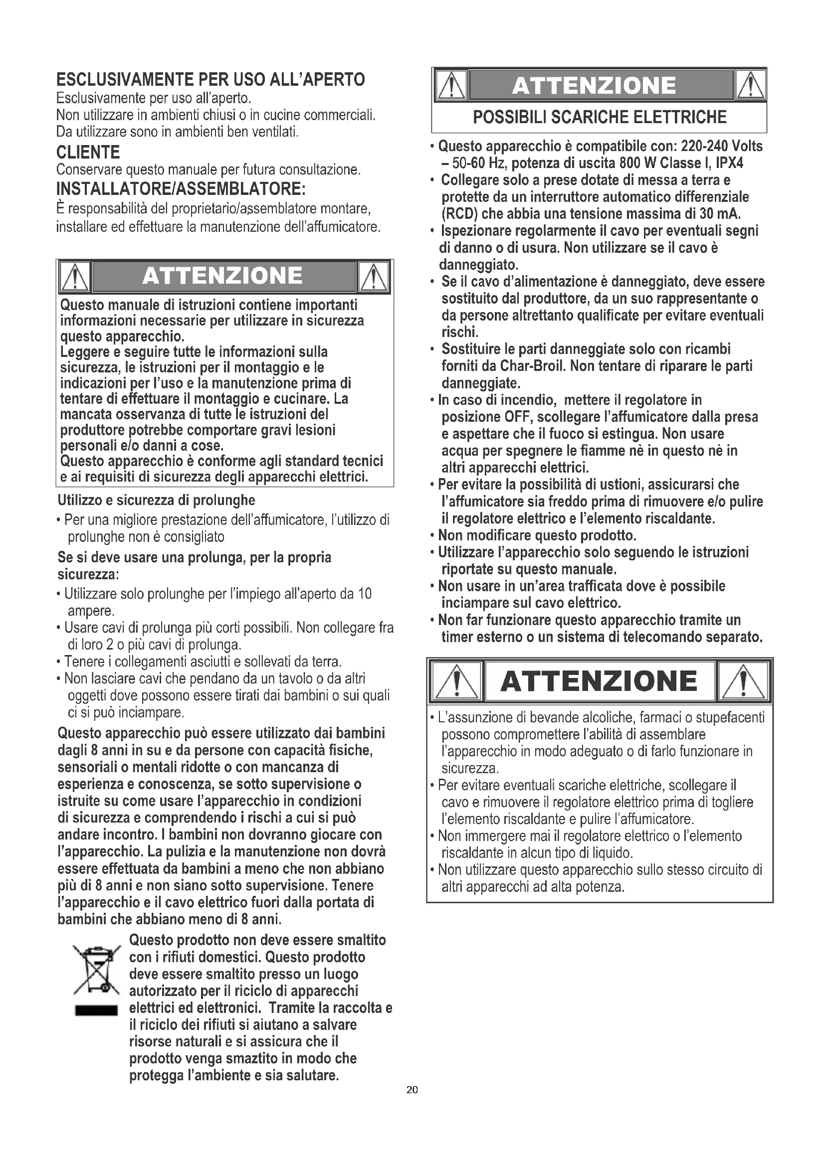 ATTENZIONE INSTALLATORE/ASSEMBLATORE: È responsabilità del proprietario/assemblatore montare, installare ed effettuare la manutenzione dell’affumicatore. Esclusivamente per uso all’aperto. Non utilizzare in ambienti chiusi o in cucine commerciali. Da utilizzare sono in ambienti ben ventilati. Questo manuale di istruzioni contiene importanti informazioni necessarie per utilizzare in sicurezza questo apparecchio. Leggere e seguire tutte le informazioni sulla sicurezza, le istruzioni per il montaggio e le indicazioni per l’uso e la manutenzione prima di tentare di effettuare il montaggio e cucinare. La mancata osservanza di tutte le istruzioni del produttore potrebbe comportare gravi lesioni personali e/o danni a cose. Questo apparecchio è conforme agli standard tecnici e ai requisiti di sicurezza degli apparecchi elettrici.
