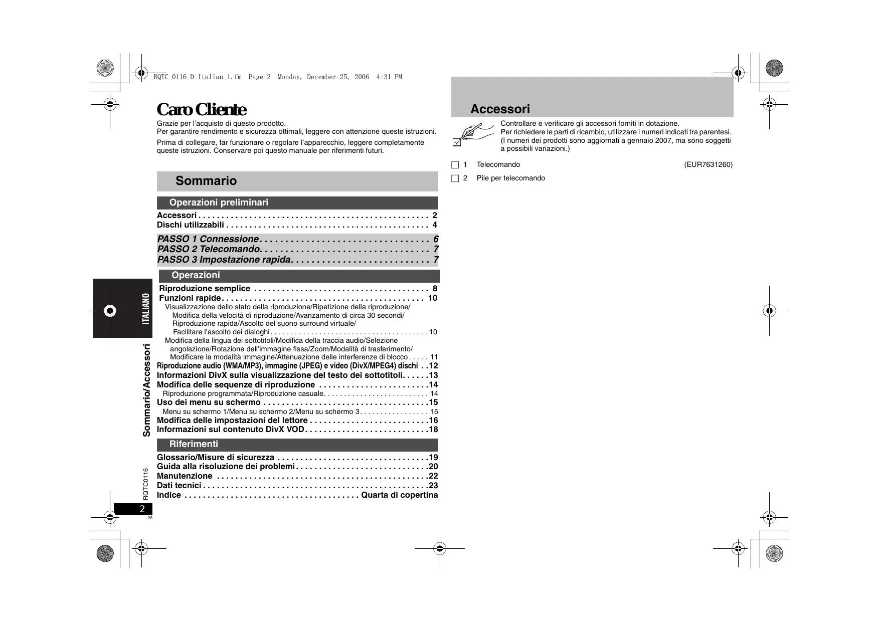 - RQTC_0116_D_Italian_1.fm Page 2 Monday, December 25, 2006 4:31 PM Caro Cliente Accessori Grazie per l’acquisto di questo prodotto. Per garantire rendimento e sicurezza ottimali, leggere con attenzione queste istruzioni. Controllare e verificare gli accessori forniti in dotazione. Per richiedere le parti di ricambio, utilizzare i numeri indicati tra parentesi. (I numeri dei prodotti sono aggiornati a gennaio 2007, ma sono soggetti a possibili variazioni.) Prima di collegare, far funzionare o regolare l’apparecchio, leggere completamente queste istruzioni. Conservare poi questo manuale per riferimenti futuri. Sommario Operazioni preliminari Accessori p. 2