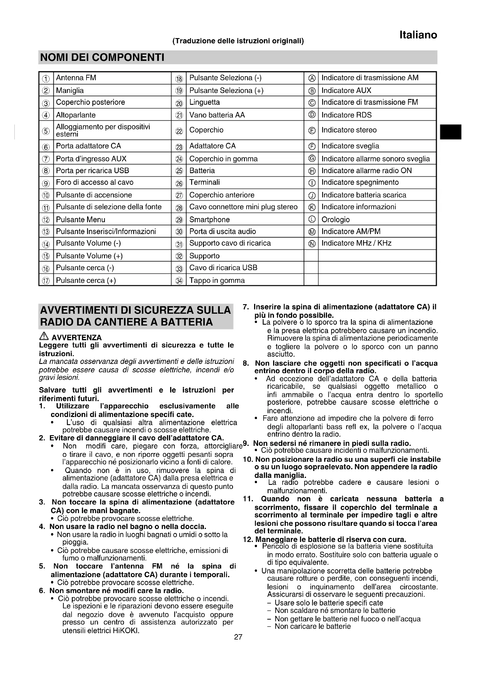 Dimensioni esterne L 366 mm x P 303 mm x A 261 mm (con l’antenna ritratta) Massa 3,4 kg ○ Per le fonti di alimentazione utilizzabili, consultare il manuale di istruzioni: Fonti di alimentazione utilizzabili: Dong Guan Sun Hung Kin Electrical Co., Ltd. (Produttore) HKP12-1201200dV, HKP12-1201200dB (Modello) ○ Solo la batteria a scorrimento può essere utilizzata (Modello) BSL1430: 14,4 V 3000 mAh Batteria al litio (Modello) BSL1830: 18 V 3000 mAh Batteria al litio (Produttore) Koki Holdings Co., Ltd. 0000BookUR18DSAL.indb280000BookUR18DSAL.indb28 2019/07/0313:51:302019/07/0313:51:3029 Italiano SIMBOLI ATTENZIONE Di seguito mostriamo i simboli usati per la macchina. Assicurarsi di comprenderne il signifi cato prima dell’uso. UR18DSAL : Radio da cantiere a batteria Per le fonti di alimentazione utilizzabili, consultare il manuale di istruzioni. Solo per Paesi UE Non gettare le apparecchiature elettriche tra i rifi uti domestici! Secondo la Direttiva Europea 2012/19/UE sui rifi uti di apparecchiature elettriche ed elettroniche e la sua attuazione in conformità alle norme nazionali, le apparecchiature elettriche esauste devono essere raccolte separatamente, al fi ne di essere reimpiegate in modo eco-compatibile. Pulsante di accensione Pulsante di selezione della fonte Pulsante Menu Pulsante Inserisci/Informazioni Pulsante Volume Pulsante cerca Pulsante Seleziona Indicatore allarme sonoro sveglia Indicatore allarme radio ON Indicatore batteria scarica ACCESSORI STANDARD In aggiunta all’unità principale (1 unità), la confezione contiene gli accessori elencati di seguito. ○ Adattatore CA ...............................................................1 ○ Batteria AA ....................................................................2 ○ Supporto cavo di ricarica ..............................................1 (per il connettore Lightning di Apple)