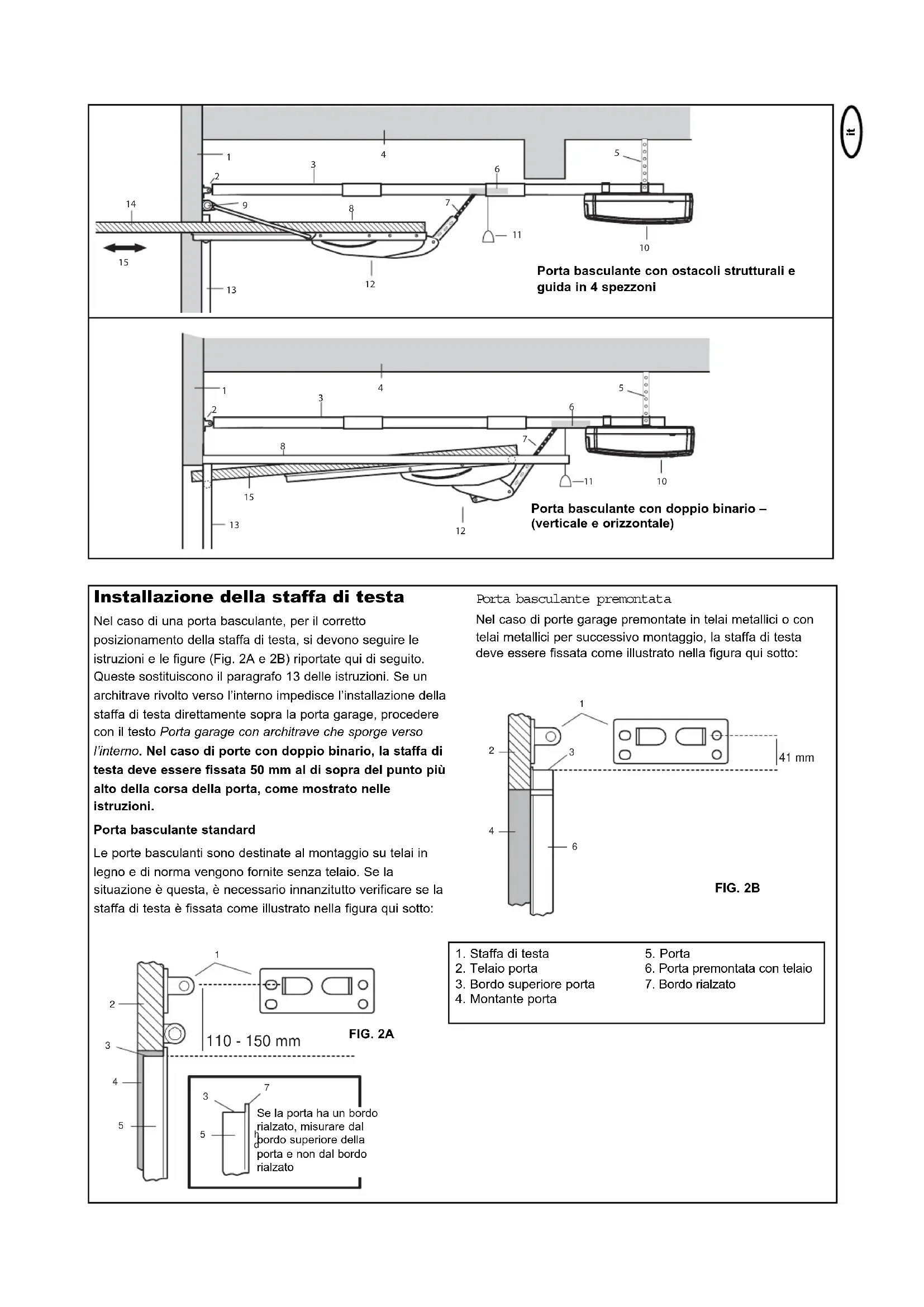 Porta basculante premontata Nel caso di porte garage premontate in telai metallici o con telai metallici per successivo montaggio, la staffa di testa deve essere fissata come illustrato nella figura qui sotto: FIG. 2A FIG. 2B Porta basculante con ostacoli strutturali e guida in 4 spezzoni Porta basculante con doppio binario – (verticale e orizzontale) Se la porta ha un bordorialzato, misurare dalbordo superiore dellaporta e non dal bordorialzato