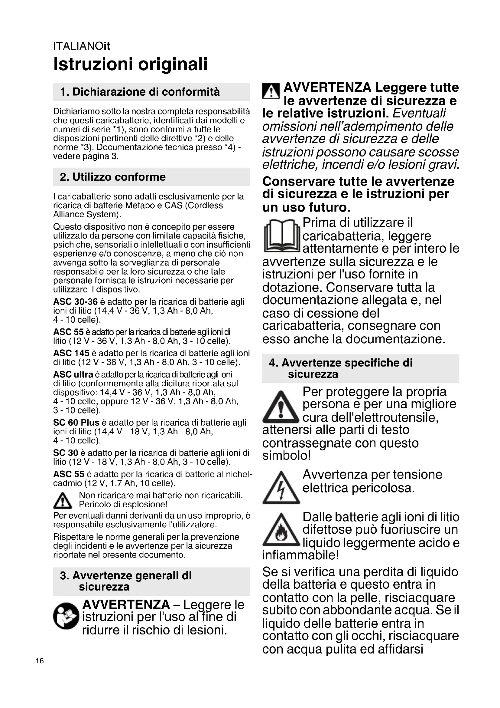 Istruzioni originali Dichiariamo sotto la nostra completa responsabilità che questi caricabatterie, identificati dai modelli e numeri di serie *1), sono conformi a tutte le disposizioni pertinenti delle direttive *2) e delle norme *3). Documentazione tecnica presso *4) - vedere pagina 3. I caricabatterie sono adatti esclusivamente per la ricarica di batterie Metabo e CAS (Cordless Alliance System). Questo dispositivo non è concepito per essere utilizzato da persone con limitate capacità fisiche, psichiche, sensoriali o intellettuali o con insufficienti esperienze e/o conoscenze, a meno che ciò non avvenga sotto la sorveglianza di personale responsabile per la loro sicurezza o che tale personale fornisca le istruzioni necessarie per utilizzare il dispositivo. ASC 30-36 è adatto per la ricarica di batterie agli ioni di litio (14,4 V - 36 V, 1,3 Ah - 8,0 Ah,