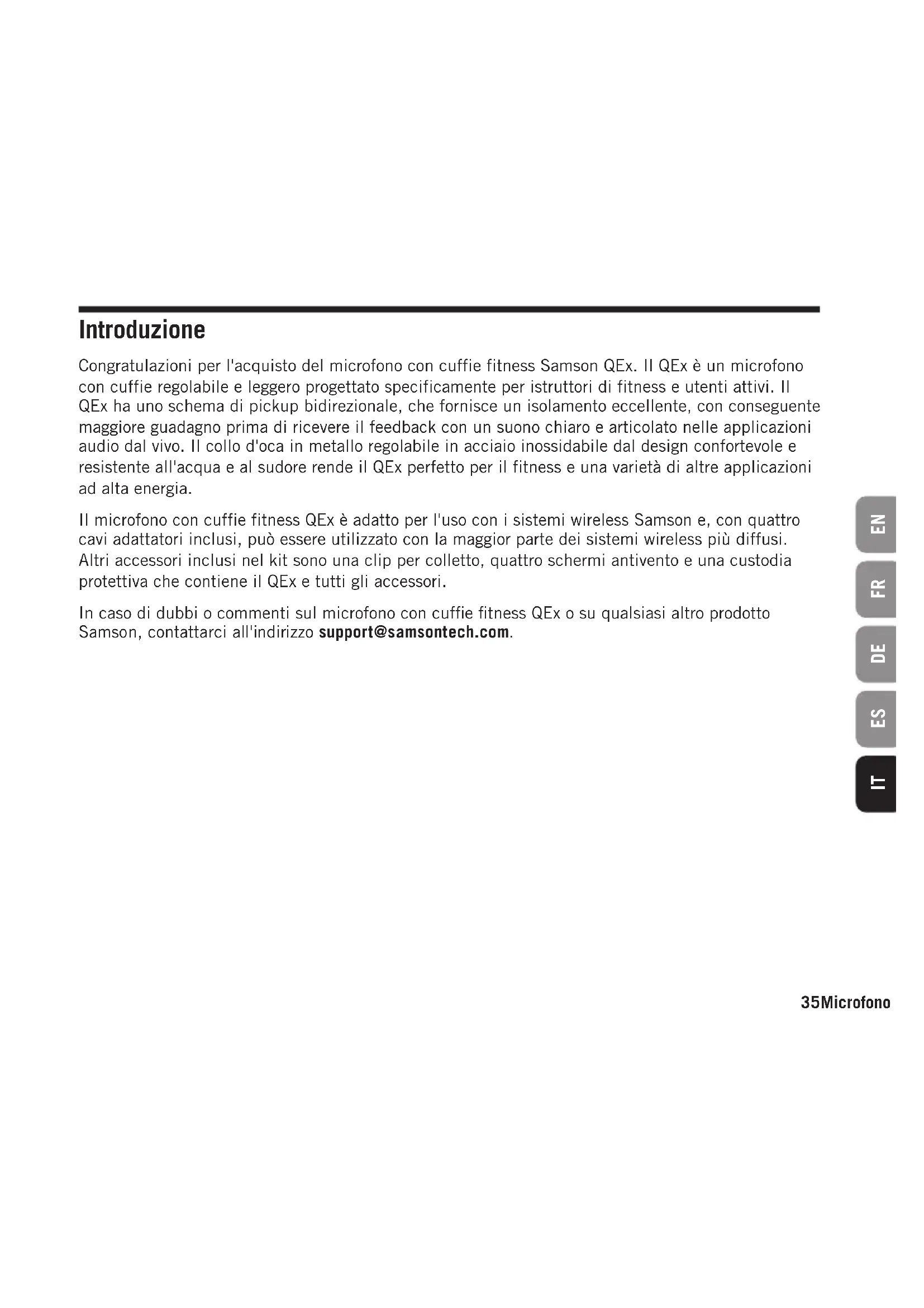 035Microfono con cuffie fitness QEx ENFRDEESIT Congratulazioni per l'acquisto del microfono con cuffie fitness Samson QEx. Il QEx è un microfono con cuffie regolabile e leggero progettato specificamente per istruttori di fitness e utenti attivi. Il QEx ha uno schema di pickup bidirezionale, che fornisce un isolamento eccellente, con conseguente maggiore guadagno prima di ricevere il feedback con un suono chiaro e articolato nelle applicazioni audio dal vivo. Il collo d'oca in metallo regolabile in acciaio inossidabile dal design confortevole e resistente all'acqua e al sudore rende il QEx perfetto per il fitness e una varietà di altre applicazioni ad alta energia. Il microfono con cuffie fitness QEx è adatto per l'uso con i sistemi wireless Samson e, con quattro cavi adattatori inclusi, può essere utilizzato con la maggior parte dei sistemi wireless più diffusi. Altri accessori inclusi nel kit sono una clip per colletto, quattro schermi antivento e una custodia protettiva che contiene il QEx e tutti gli accessori. In caso di dubbi o commenti sul microfono con cuffie fitness QEx o su qualsiasi altro prodotto Samson, contattarci all'indirizzo support@samsontech.com. Introduzione36 Per un maggiore comfort e una migliore aderenza, il microfono QEx include un archetto regolabile. Per adattare l'archetto, tirare la cinghia elastica sopra i ganci per le orecchie e posizionarla davanti al punto di arresto (A). In caso di necessità, l'archetto può essere spostato dietro il punto di arresto (B) o è possibile rimuoverlo completamente facendo scorrere l'elastico sopra i ganci auricolari e la capsula del microfono. Nota: Quando si rimuove l'archetto, rimuovere prima lo schermo antivento del microfono. Posizionamento del microfono QEx37Microfono con cuffie fitness QEx ENFRDEESIT Cavi connettori Il QEx include quattro cavi con adattatori per alcuni dei più diffusi trasmettitori beltpack per microfoni wireless. Connettore da 3,5 mm Compatibile con i sistemi wireless Sennheiser