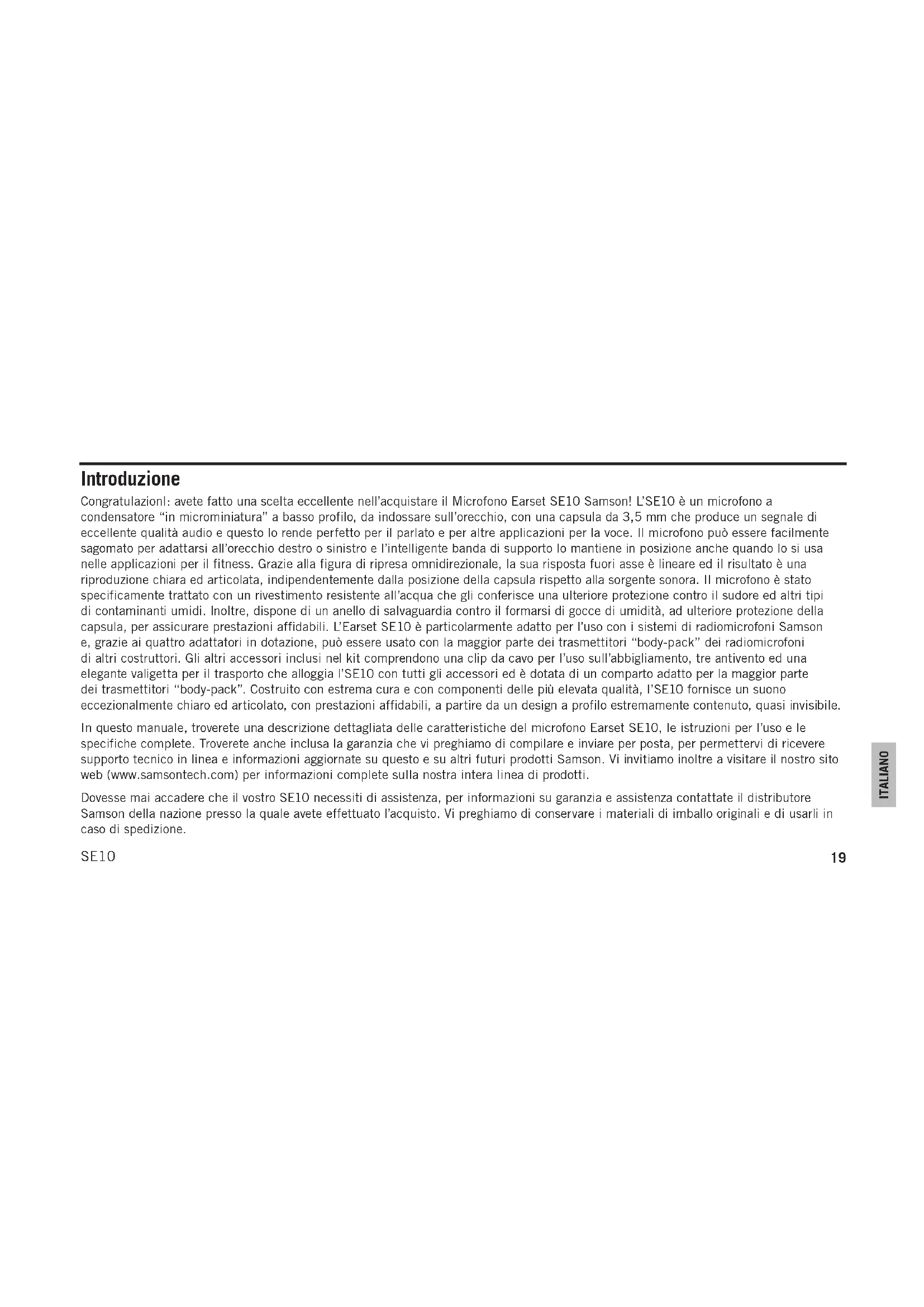 ITALIANO Introduzione CongratulazionI: avete fatto una scelta eccellente nell’acquistare il Microfono Earset SE10 Samson! L’SE10 è un microfono a condensatore “in microminiatura” a basso profilo, da indossare sull’orecchio, con una capsula da 3,5 mm che produce un segnale di eccellente qualità audio e questo lo rende perfetto per il parlato e per altre applicazioni per la voce. Il microfono può essere facilmente sagomato per adattarsi all’orecchio destro o sinistro e l’intelligente banda di supporto lo mantiene in posizione anche quando lo si usa nelle applicazioni per il fitness. Grazie alla figura di ripresa omnidirezionale, la sua risposta fuori asse è lineare ed il risultato è una riproduzione chiara ed articolata, indipendentemente dalla posizione della capsula rispetto alla sorgente sonora. Il microfono è stato specificamente trattato con un rivestimento resistente all’acqua che gli conferisce una ulteriore protezione contro il sudore ed altri tipi di contaminanti umidi. Inoltre, dispone di un anello di salvaguardia contro il formarsi di gocce di umidità, ad ulteriore protezione della capsula, per assicurare prestazioni affidabili. L’Earset SE10 è particolarmente adatto per l’uso con i sistemi di radiomicrofoni Samson e, grazie ai quattro adattatori in dotazione, può essere usato con la maggior parte dei trasmettitori “body-pack” dei radiomicrofoni di altri costruttori. Gli altri accessori inclusi nel kit comprendono una clip da cavo per l’uso sull’abbigliamento, tre antivento ed una elegante valigetta per il trasporto che alloggia l’SE10 con tutti gli accessori ed è dotata di un comparto adatto per la maggior parte dei trasmettitori “body-pack”. Costruito con estrema cura e con componenti delle più elevata qualità, l’SE10 fornisce un suono eccezionalmente chiaro ed articolato, con prestazioni affidabili, a partire da un design a profilo estremamente contenuto, quasi invisibile. In questo manuale, troverete una descrizione dettagliata delle caratteristiche del micro fono Earset SE10, le istruzioni per l’uso e le specifiche complete. Troverete anche inclusa la garanzia che vi preghiamo di compilare e inviare per posta, per permettervi di ricevere supporto tecnico in linea e informazioni aggiornate su questo e su altri futuri prodotti Samson. Vi invitiamo inoltre a visitare il nostro sito web (www.samsontech.com) per informazioni complete sulla nostra intera linea di prodotti. Dovesse mai accadere che il vostro SE10 necessiti di assistenza, per informazioni su garanzia e assistenza contattate il distributore Samson della nazione presso la quale avete effettuato l’acquisto. Vi preghiamo di conservare i materiali di imballo originali e di usarli in caso di spedizione.20 SE10 - Caratteristiche Il microfono Omnidirezionale SE10 da indossare sull’orecchio fornisce una eccellente riproduzione vocale con un design a singolo orecchio, a basso profilo, quasi invisibile. Ecco di seguito alcune delle sue caratteristiche principali.