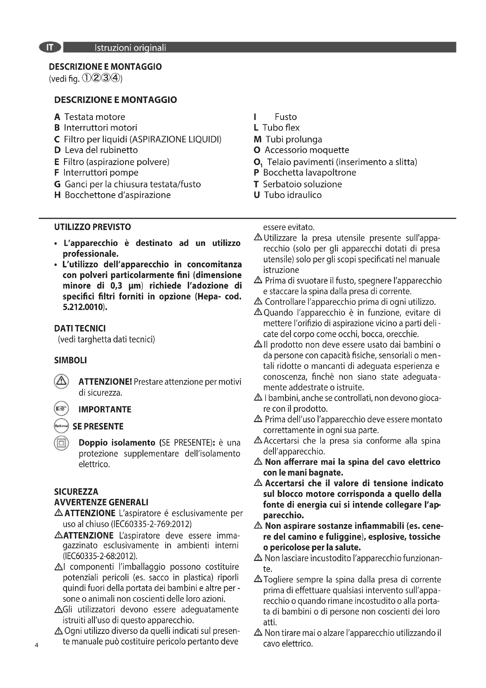 DATI TECNICI (vedi targhetta dati tecnici) SIMBOLI ATTENZIONE! Prestare attenzione per motivi di sicurezza. IMPORTANTE SE PRESENTE Doppio isolamento (SE PRESENTE): è una protezione supplementare dell’isolamento elettrico. SICUREZZA AVVERTENZE GENERALI