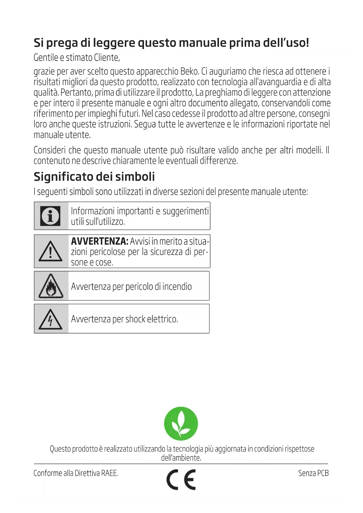 Řešení problémůSi prega di leggere questo manuale prima dell’uso! Gentile e stimato Cliente, grazie per aver scelto questo apparecchio Beko. Ci auguriamo che riesca ad ottenere i risultati migliori da questo prodotto, realizzato con tecnologia all’avanguardia e di alta qualità. Pertanto, prima di utilizzare il prodotto, La preghiamo di leggere con attenzione e per intero il presente manuale e ogni altro documento allegato, conservandoli come riferimento per impieghi futuri. Nel caso cedesse il prodotto ad altre persone, consegni loro anche queste istruzioni. Segua tutte le avvertenze e le informazioni riportate nel manuale utente. Consideri che questo manuale utente può risultare valido anche per altri modelli. Il contenuto ne descrive chiaramente le eventuali differenze. Significato dei simboli I seguenti simboli sono utilizzati in diverse sezioni del presente manuale utente: