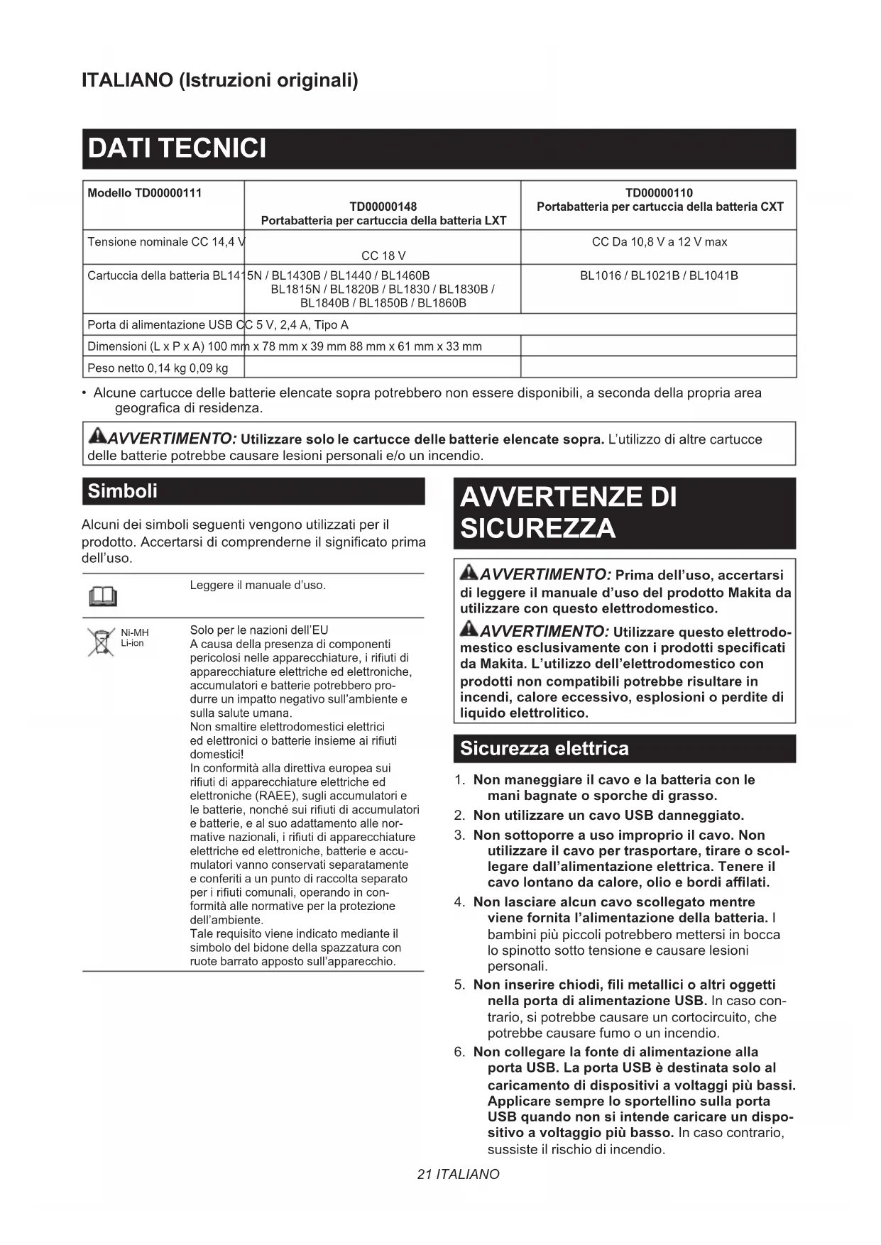 - Alcune cartucce delle batterie elencate sopra potrebbero non essere disponibili, a seconda della propria area geograca di residenza. AVVERTIMENTO: Utilizzare solo le cartucce delle batterie elencate sopra. L’utilizzo di altre cartucce delle batterie potrebbe causare lesioni personali e/o un incendio. Simboli Alcuni dei simboli seguenti vengono utilizzati per il prodotto. Accertarsi di comprenderne il signicato prima dell’uso. Leggere il manuale d’uso. Ni-MH Li-ion Solo per le nazioni dell’EU A causa della presenza di componenti pericolosi nelle apparecchiature, i riuti di apparecchiature elettriche ed elettroniche, accumulatori e batterie potrebbero pro- durre un impatto negativo sull’ambiente e sulla salute umana. Non smaltire elettrodomestici elettrici ed elettronici o batterie insieme ai riuti domestici! In conformità alla direttiva europea sui riuti di apparecchiature elettriche ed elettroniche (RAEE), sugli accumulatori e le batterie, nonché sui riuti di accumulatori e batterie, e al suo adattamento alle nor- mative nazionali, i riuti di apparecchiature elettriche ed elettroniche, batterie e accu- mulatori vanno conservati separatamente e conferiti a un punto di raccolta separato per i riuti comunali, operando in con- formità alle normative per la protezione dell’ambiente. Tale requisito viene indicato mediante il simbolo del bidone della spazzatura con ruote barrato apposto sull’apparecchio. AVVERTENZE DI SICUREZZA AVVERTIMENTO: Prima dell’uso, accertarsi di leggere il manuale d’uso del prodotto Makita da utilizzare con questo elettrodomestico. AVVERTIMENTO: Utilizzare questo elettrodo- mestico esclusivamente con i prodotti specicati da Makita. L’utilizzo dell’elettrodomestico con prodotti non compatibili potrebbe risultare in incendi, calore eccessivo, esplosioni o perdite di liquido elettrolitico. Sicurezza elettrica