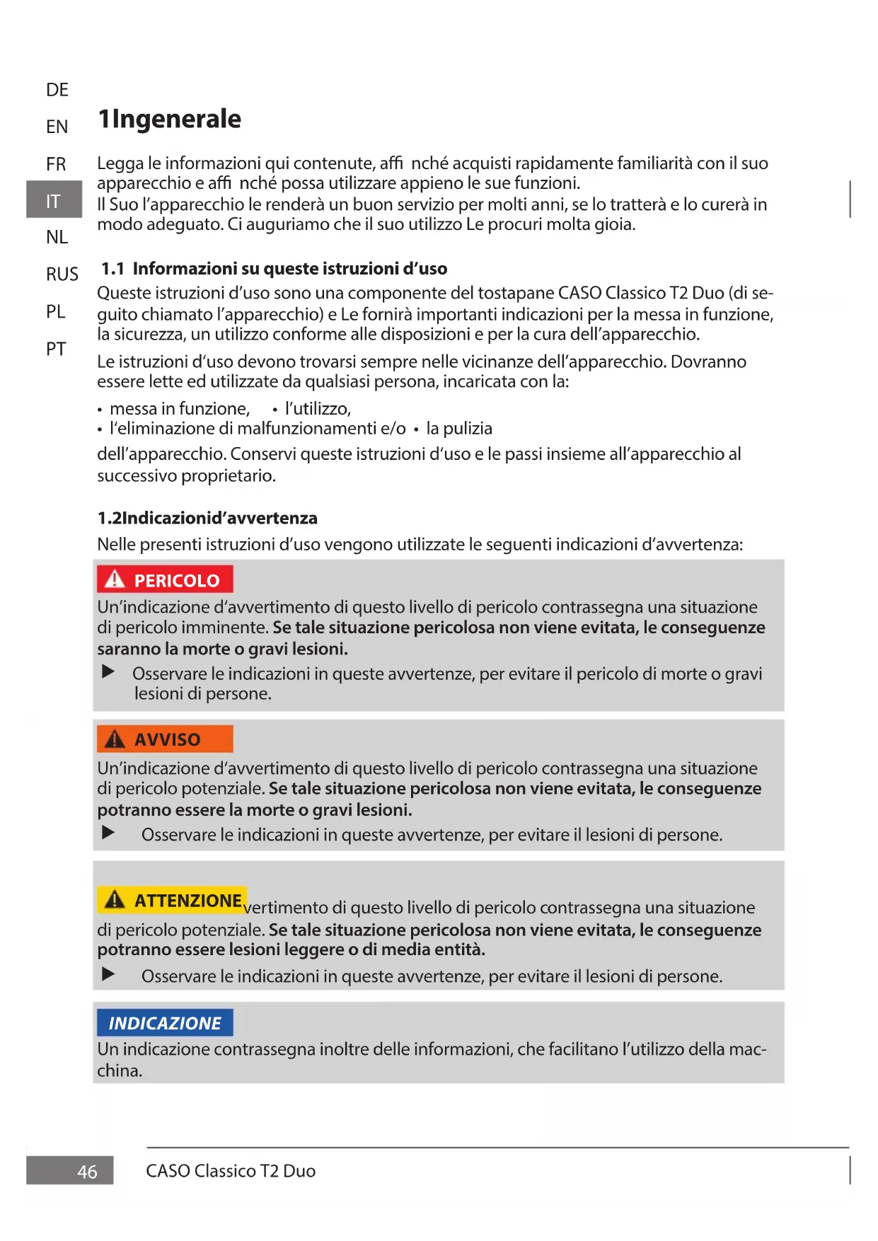 Queste istruzioni d’uso sono una componente del tostapane CASO Classico T2 Duo (di se- guito chiamato l’apparecchio) e Le fornirà importanti indicazioni per la messa in funzione, la sicurezza, un utilizzo conforme alle disposizioni e per la cura dell’apparecchio. Le istruzioni d‘uso devono trovarsi sempre nelle vicinanze dell’apparecchio. Dovranno essere lette ed utilizzate da qualsiasi persona, incaricata con la: