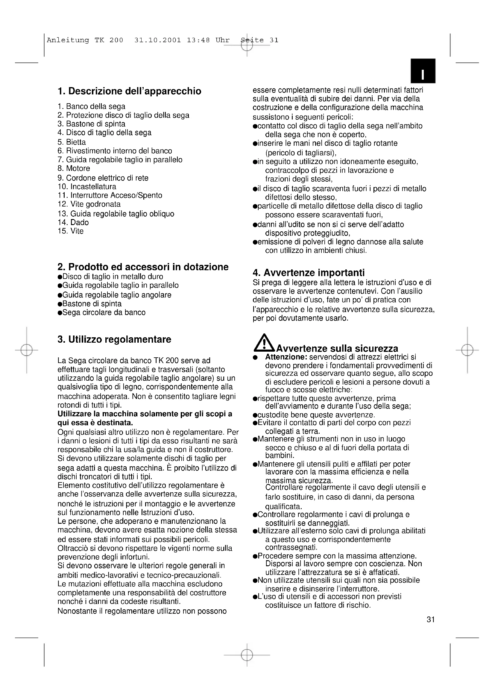 Utilizzare il tamburo avvolgicavo solo con cavo srotolato. Controllate il cordone di collegamento alla rete elettrica (9). Non portare la sega tenendola per il cordone elettrico di rete. Non utilizzate il cavo, per staccare la spina dalla presa di corrente. Proteggete il cavo da calore eccessivo, olio e spigoli taglienti. Non esporre la sega alla pioggia, e non usare la macchina in ambiente umido o bagnato. Fate si che l’illuminazione sia buona. Non tagliate essendo vicino a liquidi infiammabili o a gas. Portate indumenti da lavoro idonei! Gli indumenti larghi o i gioielli possono venire afferrati dal disco di taglio rotante. Se avete i capelli lunghi, portate una reticella. Evitate di tenere il corpo in posizione anormale. La persona che adopera la sega deve avere almeno 18 anni e gli apprendisti almeno 16 anni di età però operanti solo se sorvegliati. Tenere lontani i bambini dall’apparecchio collegato alla rete elettrica. Non permettete ad altre persone, in particolar modo a bambini, di toccare l’attrezzo o il cavo elettrico. Teneteli lontani dal posto di lavoro. Tenete libero il posto di lavoro da scarti di legno e da altri pezzi sparsi intorno. Non distogliere dal loro lavoro le persone che stanno usando la macchina. Tenete conto del senso rotatorio del disco di taglio della sega. Non frenate per nessun motivo i dischi di taglio (4), premendovi contro lateralmente, dopo aver spento l’organo d’azionamento. Montate solamente dischi di taglio ben affilati, senza fessure e non deformati (4). Non utilizzate dischi di taglio per sega circolare (4) in acciaio lavorabile ad alta velocità e d’alta lega (acciaio HHS). Sulla macchina si devono utilizzare solamente utensili che rispondono alla prEN-847-1;1996. I dischi di taglio difettosi (4) devono essere immediatamente sostituiti. Non usate dischi di taglio che non rispondono alle caratteristiche specificate nelle presenti Istruzioni d’uso. Ci si deve accertare che tutti i dispositivi (2, 15), che coprono il disco della sega, funzionino perfettamente. Il tettuccio di protezione mobile (2), se aperto, non lo si deve bloccare. I dispositivi di sicurezza (2, 5) della macchina non li si deve smontare o renderli inutilizzabili. I dispositivi di sicurezza danneggiati o guasti li si deve immediatamente sostituire. La bietta (5) è un dispositivo di sicurezza importante, il quale guida il pezzo in lavorazione ed impedisce che la fenditura del taglio, dietro al disco di taglio della sega, si chiuda e il pezzo in lavorazione rinculi. Fate attenzione allo spessore della bietta. Lo spessore della bietta non deve inferiore a quello del disco di taglio della sega o essere superiore alla fenditura del taglio eseguito dallo stesso. In ogni fase di lavoro, il tettuccio di protezione (2) deve essere abbassato sul pezzo in lavorazione. Dovendo tagliare longitudinalmente dei pezzi da lavorare sottili, è assolutamente necessario servirsi di un bastone di spinta per spingerli (3) (larghezza inferiore a 120 mm). Dovendo tagliare pezzi di legno stretti, la guida regolabile taglio in parallelo la si dovrà bloccare sul lato destro del disco della sega. Attenzione: con questa sega non si devono effettuare tagli da riporto Non tagliate nessun pezzo da lavorare troppo piccolo, per poterlo tenere stretto nella mano. Operare sempre lateralmente rispetto al disco di taglio della sega. Non caricare la macchina fino a farla fermare completamente. Premere sempre e con forza il pezzo in lavorazione contro il banco di lavoro (1). Fate attenzione che i pezzi di legno tagliati non vengano afferrati dalla corona dentata del disco di taglio della sega e scaraventati via. Non allontanate mai schegge, segatura o pezzi di legni incastratisi nel disco di taglio della sega rotante. Per eliminare gli inconvenienti o allontanare i pezzi di legno incastratisi, spegnere la macchina - staccare la spina dalla presa di rete. In caso di demolizione della fenditura della sega, ricambiare il rivestimento interno del banco (6) - staccare la spina dalla presa di rete. Effettuare eventuali trasformazioni, lavori di aggiustaggio, di misurazione e di pulizia soltanto con macchina ferma - staccare la spina dalla presa di rete. Prima dell’avviamento, verificare che le chiavi e gli utensili usati per l’aggiustaggio siano stati allontanati. Anleitung TK 200 31.10.2001 13:48 Uhr Seite 32I