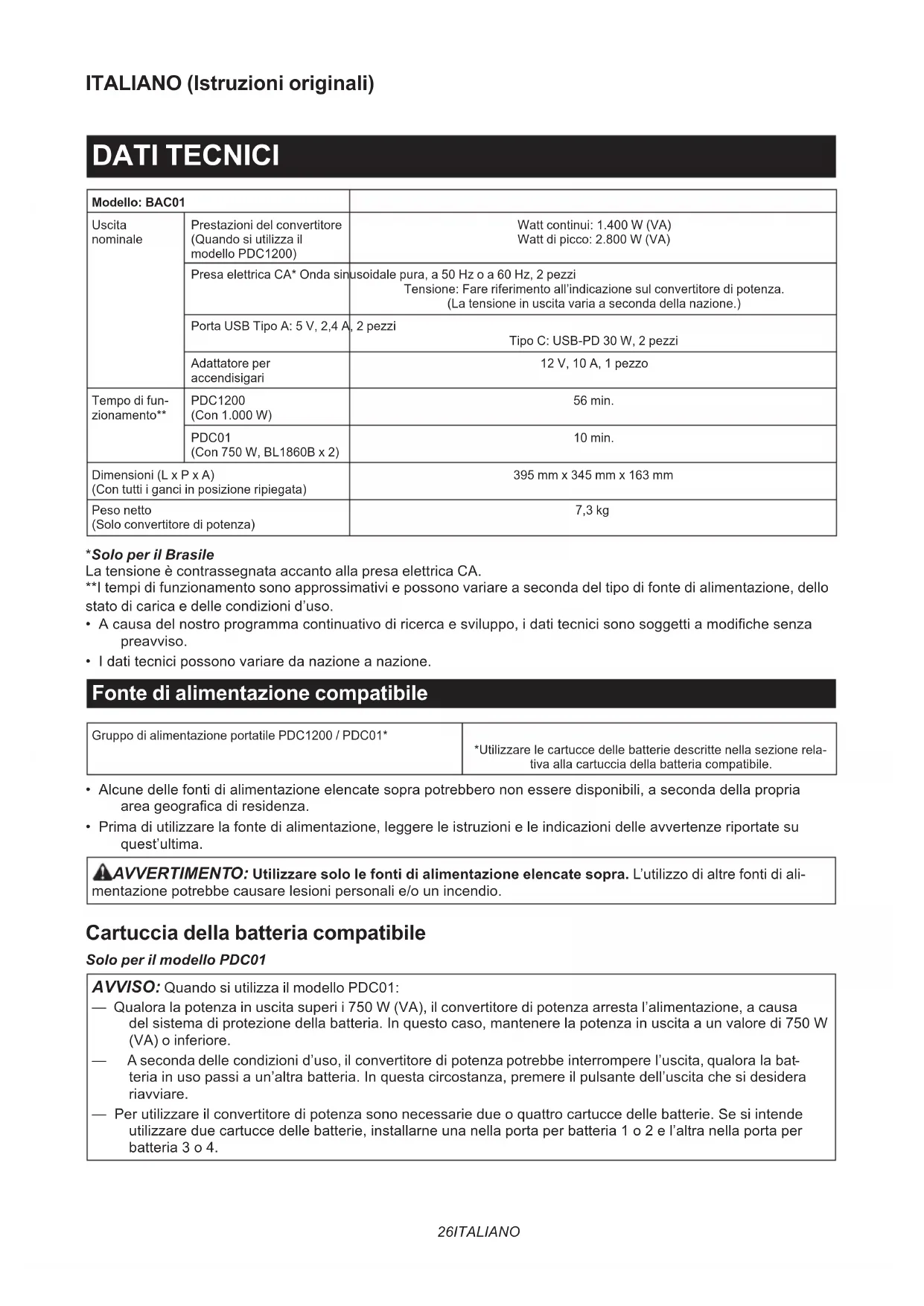 - MAKPAC HINWEIS: Manche Teile in der Liste können als Standardzubehör im Werkzeugsatz enthalten sein. Sie können von Land zu Land unterschiedlich sein.26 ITALIANO ITALIANO (Istruzioni originali) DATI TECNICI Modello: BAC01 Uscita nominale Prestazioni del convertitore (Quando si utilizza il modello PDC1200) Watt continui: 1.400 W (VA) Watt di picco: 2.800 W (VA) Presa elettrica CA* Onda sinusoidale pura, a 50 Hz o a 60 Hz, 2 pezzi Tensione: Fare riferimento all’indicazione sul convertitore di potenza. (La tensione in uscita varia a seconda della nazione.) Porta USB Tipo A: 5 V, 2,4 A, 2 pezzi Tipo C: USB-PD 30 W, 2 pezzi Adattatore per accendisigari 12 V, 10 A, 1 pezzo Tempo di fun- zionamento** PDC1200 (Con 1.000 W) 56 min. PDC01 (Con 750 W, BL1860B x 2) 10 min. Dimensioni (L x P x A) (Con tutti i ganci in posizione ripiegata) 395 mm x 345 mm x 163 mm Peso netto (Solo convertitore di potenza) 7,3 kg *Solo per il Brasile La tensione è contrassegnata accanto alla presa elettrica CA. **I tempi di funzionamento sono approssimativi e possono variare a seconda del tipo di fonte di alimentazione, dello stato di carica e delle condizioni d’uso.
