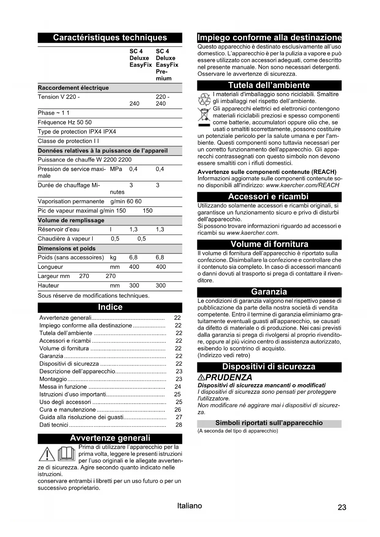 a chaudière à vapeur est entartrée. Détartrer la chaudière à vapeur. Prélèvement d’eau élevé La chaudière à vapeur est entartrée. Détartrer la chaudière à vapeur. Plage de dureté °dH mmol/l TF I douce 0 - 7 0 - 1,3 100 II moyenne 7 - 14 1,3 - 2,5 90 III dure 14 - 21 2,5 - 3,8 75 IV très dure >21 >3,8 5023 Italiano Caractéristiques techniques Sous réserve de modifications techniques. Indice Avvertenze generali Prima di utilizzare l’apparecchio per la prima volta, leggere le presenti istruzioni per l’uso originali e le allegate avverten- ze di sicurezza. Agire secondo quanto indicato nelle istruzioni. conservare entrambi i libretti per un uso futuro o per un successivo proprietario. Impiego conforme alla destinazione Questo apparecchio è destinato esclusivamente all’uso domestico. L’apparecchio è per la pulizia a vapore e può essere utilizzato con accessori adeguati, come descritto nel presente manuale. Non sono necessari detergenti. Osservare le avvertenze di sicurezza. Tutela dell’ambiente I materiali d'imballaggio sono riciclabili. Smaltire gli imballaggi nel rispetto dell’ambiente. Gli apparecchi elettrici ed elettronici contengono materiali riciclabili preziosi e spesso componenti come batterie, accumulatori oppure olio che, se usati o smaltiti scorrettamente, possono costituire un potenziale pericolo per la salute umana e per l'am- biente. Questi componenti sono tuttavia necessari per un corretto funzionamento dell'apparecchio. Gli appa- recchi contrassegnati con questo simbolo non devono essere smaltiti con i rifiuti domestici. Avvertenze sulle componenti contenute (REACH) Informazioni aggiornate sulle componenti contenute so- no disponibili all'indirizzo: www.kaercher.com/REACH Accessori e ricambi Utilizzando solamente accessori e ricambi originali, si garantisce un funzionamento sicuro e privo di disturbi dell'apparecchio. Si possono trovare informazioni riguardo ad accessori e ricambi su www.kaercher.com. Volume di fornitura Il volume di fornitura dell’apparecchio è riportato sulla confezione. Disimballare la confezione e controllare che il contenuto sia completo. In caso di accessori mancanti o danni dovuti al trasporto si prega di contattare il riven- ditore. Garanzia Le condizioni di garanzia valgono nel rispettivo paese di pubblicazione da parte della nostra società di vendita competente. Entro il termine di garanzia eliminiamo gra- tuitamente eventuali guasti all’apparecchio, se causati da difetto di materiale o di produzione. Nei casi previsti dalla garanzia si prega di rivolgersi al proprio rivendito- re, oppure al più vicino centro di assistenza autorizzato, esibendo lo scontrino di acquisto. (Indirizzo vedi retro) Dispositivi di sicurezza 몇 PRUDENZA Dispositivi di sicurezza mancanti o modificati I dispositivi di sicurezza sono pensati per proteggere l'utilizzatore. Non modificare né aggirare mai i dispositivi di sicurez- za. Simboli riportati sull’apparecchio (A seconda del tipo di apparecchio) SC 4 Deluxe EasyFix SC 4 Deluxe EasyFix Pre- mium Raccordement électrique Tension V 220 -