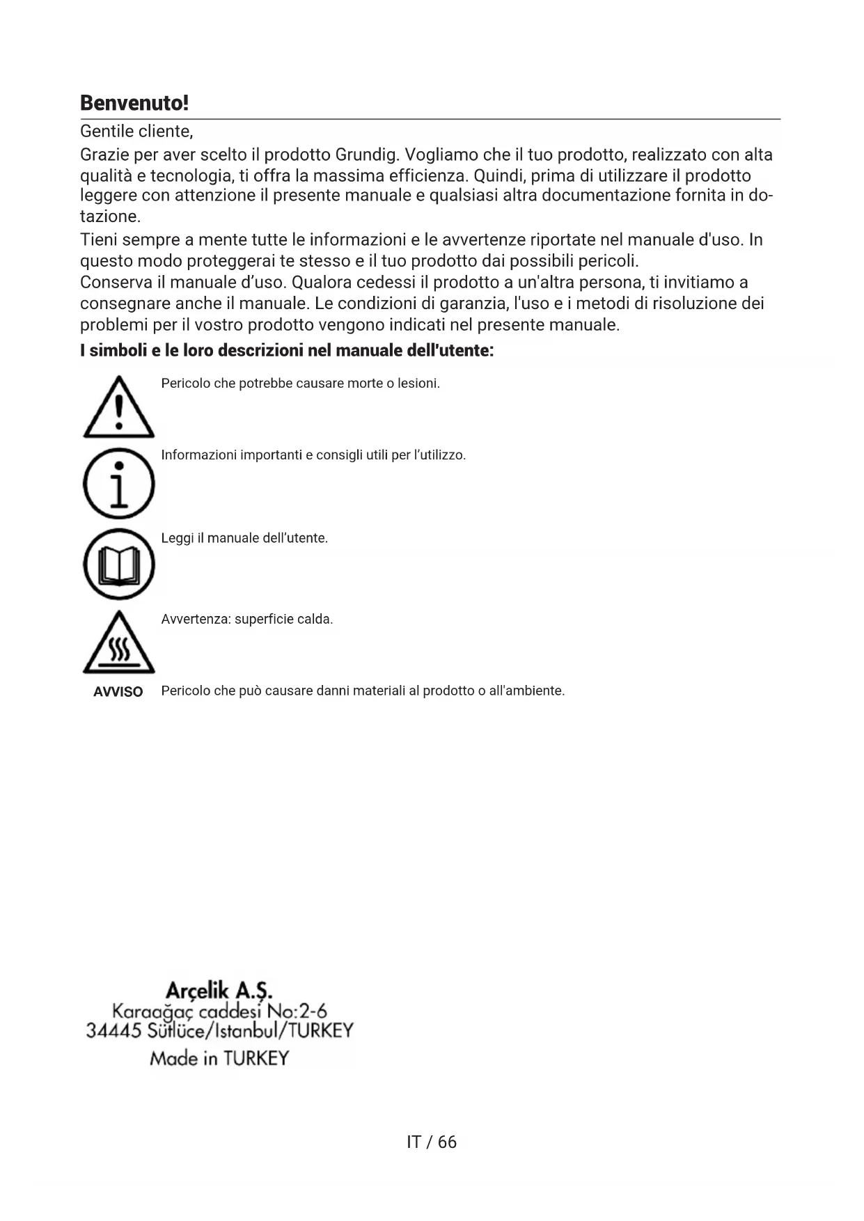 ITIT / 66 Benvenuto! Gentile cliente, Grazie per aver scelto il prodotto Grundig. Vogliamo che il tuo prodotto, realizzato con alta qualità e tecnologia, ti offra la massima efficienza. Quindi, prima di utilizzare il prodotto leggere con attenzione il presente manuale e qualsiasi altra documentazione fornita in do- tazione. Tieni sempre a mente tutte le informazioni e le avvertenze riportate nel manuale d'uso. In questo modo proteggerai te stesso e il tuo prodotto dai possibili pericoli. Conserva il manuale d’uso. Qualora cedessi il prodotto a un'altra persona, ti invitiamo a consegnare anche il manuale. Le condizioni di garanzia, l'uso e i metodi di risoluzione dei problemi per il vostro prodotto vengono indicati nel presente manuale. I simboli e le loro descrizioni nel manuale dell'utente: Pericolo che potrebbe causare morte o lesioni. Informazioni importanti e consigli utili per l’utilizzo. Leggi il manuale dell’utente. Avvertenza: superficie calda. AVVISO Pericolo che può causare danni materiali al prodotto o all'ambiente.IT / 67 Indice 1 Istruzioni relative alla sicurezza .. 68