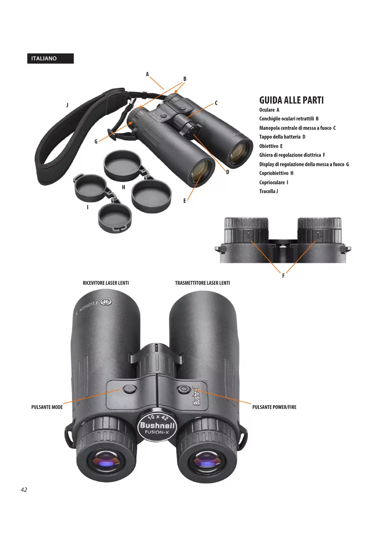 Grazie per aver acquistato il nuovo binocolo telemetro Bushnell® Fusion™ X. Questo manuale consente di ottimizzare la qualità di visione spiegando come regolare il binocolo telemetro agli occhi e come prendersi cura di questo strumento. NON GUARDARE MAI DIRETTAMENTE IL SOLE CON IL