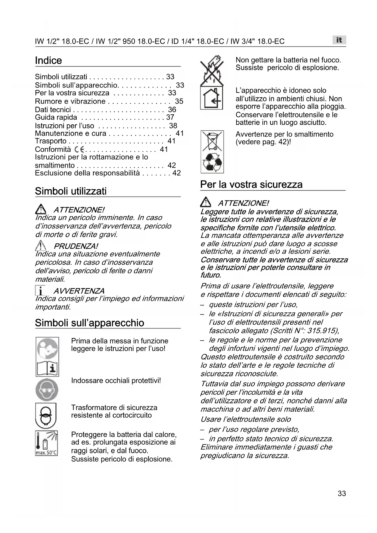 Utilizzo conforme alle finalità d’uso L’avvitatore a percussione a batteria IW 1/2" 18.0-EC / IW 1/2" 950 18.0-EC / ID 1/4" 18.0-EC / IW 3/4" 18.0-EC è concepito – per l’impiego professionale nell’industria e nell’artigianato, – per il serraggio e la svitatura di dadi e viti delle dimensioni indicate. Avvertenza di sicurezza per trapani e avvitatori Quando si eseguono lavori durante i quali l’utensile montato o la vite potrebbero toccare linee elettriche nascoste oppure il cavo di alimentazione dell’apparecchio, afferrare l’elettroutensile solo sulle superfici di presa isolate. Il contatto della vite con una linea elettrica sotto tensione può mettere sotto tensione anche le parti metalliche dell’elettroutensile e provocare una scossa elettrica. Utilizzare le impugnature supplementari, ove fornite in dotazione insieme all’elettroutensile. La perdita del controllo può causare lesioni. Utilizzare idonei rilevatori per sondare la presenza di linee di alimentazione nascoste, o consultare la locale società di fornitura. Il contatto con linee elettriche può causare incendi e scosse elettriche. Il danneggiamento di una tubazione del gas può causare un’esplosione. La penetrazione in una conduttura dell’acqua provoca danni alle cose. Se l’utensile montato si blocca, spegnere subito l’elettroutensile. Occorre essere pronti alle elevate coppie di reazione che causano un contraccolpo. L’utensile montato si blocca se: – l’elettroutensile viene sovraccaricato oppure – resta incastrato nel pezzo in lavorazione. Afferrare saldamente l’elettroutensile. Eseguendo il serraggio o il rilascio delle viti, possono verificarsi per breve tempo elevate coppie di reazione. Bloccare il pezzo da lavorare. Un pezzo da lavorare fissato saldamente in un dispositivo di bloccaggio oppure in una morsa è tenuto con sicurezza maggiore che con la sola mano. Prima di riporre l’elettroutensile, attendere che si sia completamente arrestato. L’utensile montato può restare agganciato ad oggetti e, conseguentemente, si può perdere il controllo dell’elettroutensile. Utilizzare solo batterie originali, con la tensione indicata sulla targhetta del tipo dell’elettroutensile. In caso di utilizzo di altre batterie, ad es. imitazioni, batterie manipolate o di altri produttori, sussiste il pericolo di infortuni e danni alle cose a causa dell’esplosione delle batterie. Avvertenze di sicurezza per la manipolazione delle batterie Non aprire mai la batteria. Pericolo di cortocircuito. Proteggere la batteria dal calore, ad es. dalla prolungata esposizione ai raggi solari, dal fuoco, dall’acqua e dall’umidità. Sussiste pericolo di esplosione. In caso di danneggiamento ed utilizzo improprio, dalla batteria possono fuoriuscire vapori. Provvedere al ricambio di aria e, in caso di malessere, rivolgersi a un medico. I vapori possono irritare le vie respiratorie. In caso d’impiego non corretto, dalla batteria possono fuoriuscire liquidi. Evitarne il contatto. In caso di contatto accidentale, risciacquare con acqua. Qualora il liquido dovesse entrare in contatto con gli occhi, chiedere immediato consiglio al medico. Il liquido fuoriuscito dalla batteria può causare irritazioni cutanee o bruciature. Caricare la batteria esclusivamente con caricabatterie consigliati dal produttore. Se un caricabatterie previsto per un determinato tipo di batterie viene utilizzato con batterie di tipo diverso, sussiste pericolo di incendio.IW 1/2" 18.0-EC / IW 1/2" 950 18.0-EC / ID 1/4" 18.0-EC / IW 3/4" 18.0-EC