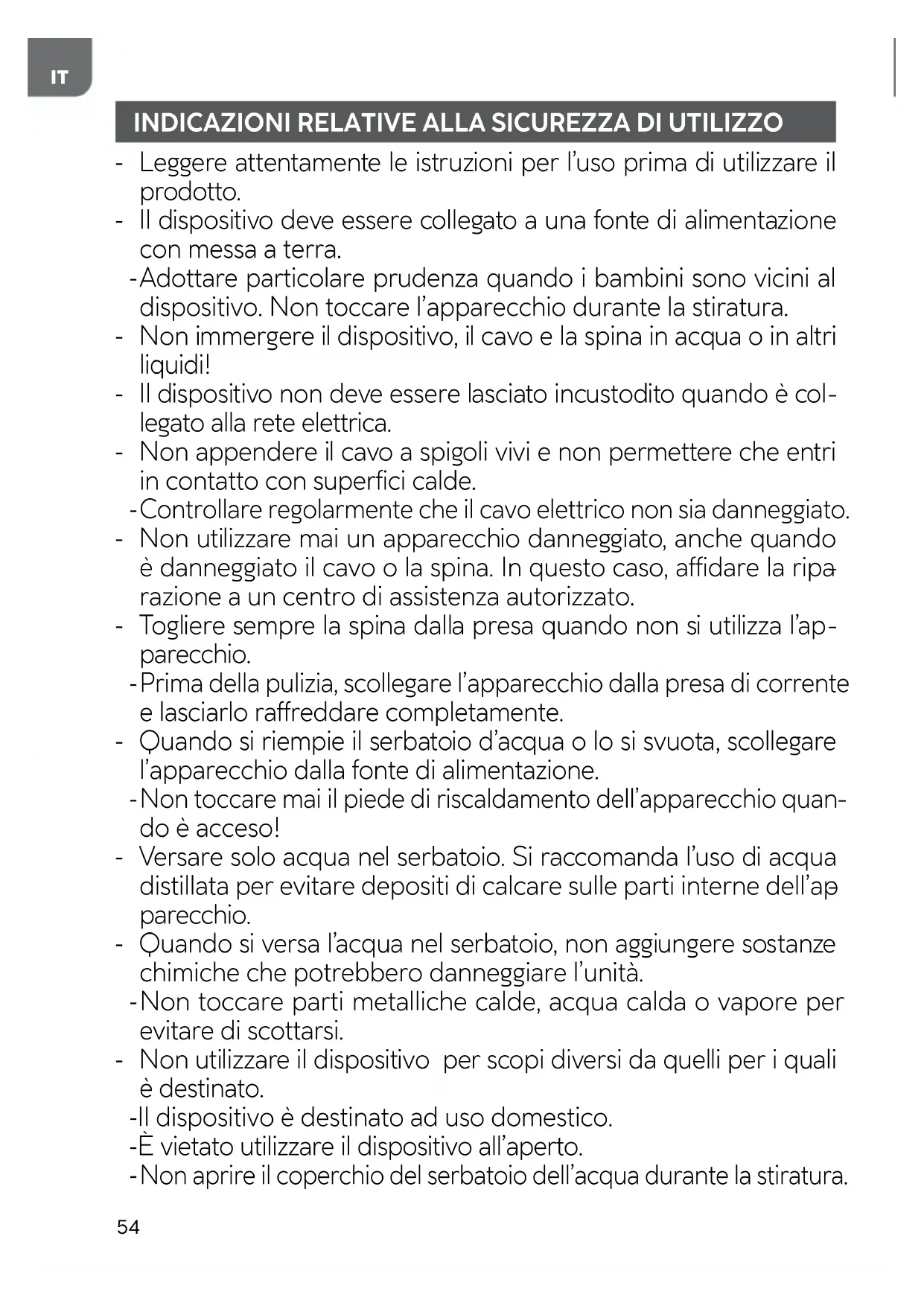 Non toccare parti metalliche calde, acqua calda o vapore per evitare di scottarsi. - Non utilizzare il dispositivo per scopi diversi da quelli per i quali è destinato. - Il dispositivo è destinato ad uso domestico. - È vietato utilizzare il dispositivo all’aperto.