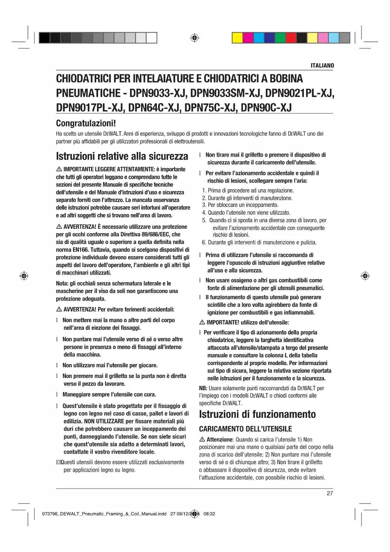 m Attenzione: Quando si carica l’utensile 1) Non posizionare mai una mano o qualsiasi parte del corpo nella zona di scarico dell’utensile; 2) Non puntare mai l’utensile verso di sé o di chiunque altro; 3) Non tirare il grilletto o abbassare il dispositivo di sicurezza, onde evitare l’attuazione accidentale, con possibile rischio di lesioni. CHIODATRICI PER INTELAIATURE E CHIODATRICI A BOBINA PNEUMATICHE - DPN9033-XJ, DPN9033SM-XJ, DPN9021PL-XJ, DPN9017PL-XJ, DPN64C-XJ, DPN75C-XJ, DPN90C-XJ Congratulazioni! Ha scelto un utensile DEWALT. Anni di esperienza, sviluppo di prodotti e innovazioni tecnologiche fanno di DEWALT uno dei partner più affidabili per gli utilizzatori professionali di elettroutensili. 073796_DEWALT_Pneumatic_Framing_&_Coil_Manual.indd 27 08/12/2016 08:32ITALIANO
