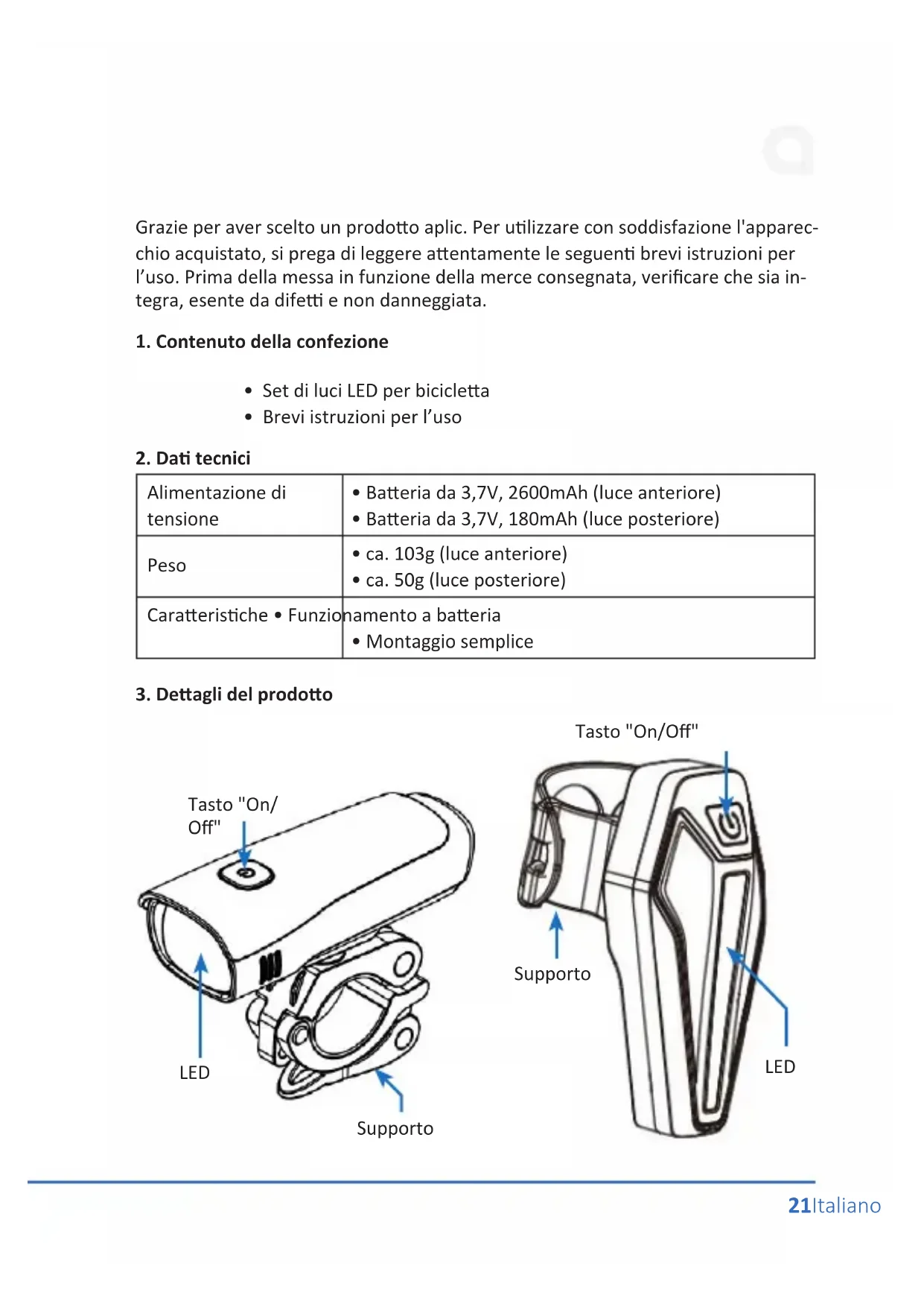 - Baeria da 3,7V, 2600mAh (luce anteriore)