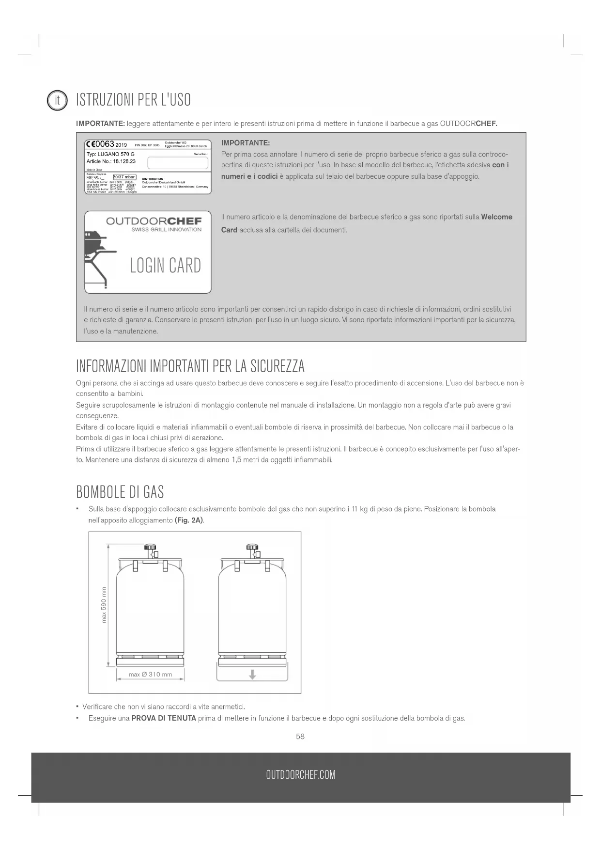 IMPORTANTE:Per prima cosa annotare il numero di serie del proprio barbecue sferico a gas sulla controco- pertina di queste istruzioni per l'uso. In base al modello del barbecue, l’etichetta adesiva con i numeri e i codici è applicata sul telaio del barbecue oppure sulla base d'appoggio.Il numero articolo e la denominazione del barbecue sferico a gas sono riportati sulla Welcome Card acclusa alla cartella dei documenti. Il numero di serie e il numero articolo sono importanti per consentirci un rapido disbrigo in caso di richieste di informazioni, ordini sostitutivi e richieste di garanzia. Conservare le presenti istruzioni per l'uso in un luogo sicuro. Vi sono riportate informazioni importanti per la sicurezza, l'uso e la manutenzione. LOGIN CARD CE Label 2019 LUGANO 570 G Outdoorchef AGEggbühlstrasse 28, 8050 Zürich - Switzerland Created byANB Realised by anbVersion date21.06.2018 Replace Page 1 of 1File Nr. PM 10058-86File name CE Label 2019 LUGANO G Label size 45x105 side burner )Qn=3.2kW (228g/h 2AAR12CT130900137 2AAR12 CT1 3 0 9 0013 7