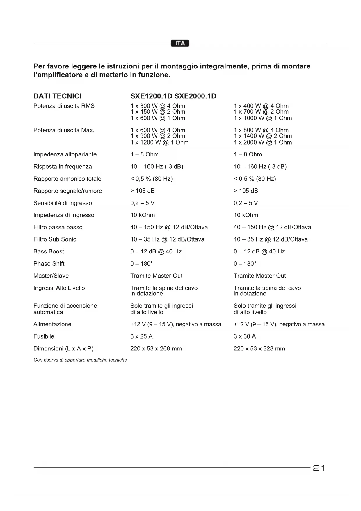 5.Faiteseffectuerparvotremécanicienunessaidechargeauniveaudel’alternateuretdelabatterie.Vériezquelecircuit électrique du véhicule fonctionne correctement,notamment le distributeur,les bougies et leurs câbles,le régulateur de tension, etc.21 Per favore leggere le istruzioni per il montaggio integralmente, prima di montare l’amplicatore e di metterlo in funzione. DATI TECNICI Potenza di uscita RMS Potenza di uscita Max. Impedenza altoparlante Risposta in frequenza Rapporto armonico totale Rapporto segnale/rumore Sensibilità di ingresso Impedenza di ingresso Filtro passa basso Filtro Sub Sonic Bass Boost Phase Shift Master/Slave Ingressi Alto Livello Funzione di accensione automatica Alimentazione Fusibile Dimensioni (L x A x P) 1 x 300 W @ 4 Ohm 1 x 450 W @ 2 Ohm 1 x 600 W @ 1 Ohm 1 x 600 W @ 4 Ohm 1 x 900 W @ 2 Ohm 1 x 1200 W @ 1 Ohm 1 – 8 Ohm 10 – 160 Hz (-3 dB) < 0,5 % (80 Hz) > 105 dB 0,2 – 5 V 10 kOhm 40 – 150 Hz @ 12 dB/Ottava 10 – 35 Hz @ 12 dB/Ottava 0 – 12 dB @ 40 Hz 0 – 180° Tramite Master Out Tramite la spina del cavo in dotazione Solo tramite gli ingressi di alto livello +12 V (9 – 15 V), negativo a massa 3 x 25 A 220 x 53 x 268 mm 1 x 400 W @ 4 Ohm 1 x 700 W @ 2 Ohm 1 x 1000 W @ 1 Ohm 1 x 800 W @ 4 Ohm 1 x 1400 W @ 2 Ohm 1 x 2000 W @ 1 Ohm 1 – 8 Ohm 10 – 160 Hz (-3 dB) < 0,5 % (80 Hz) > 105 dB 0,2 – 5 V 10 kOhm 40 – 150 Hz @ 12 dB/Ottava 10 – 35 Hz @ 12 dB/Ottava 0 – 12 dB @ 40 Hz 0 – 180° Tramite Master Out Tramite la spina del cavo in dotazione Solo tramite gli ingressi di alto livello +12 V (9 – 15 V), negativo a massa 3 x 30 A 220 x 53 x 328 mm Con riserva di apportare modiche tecniche