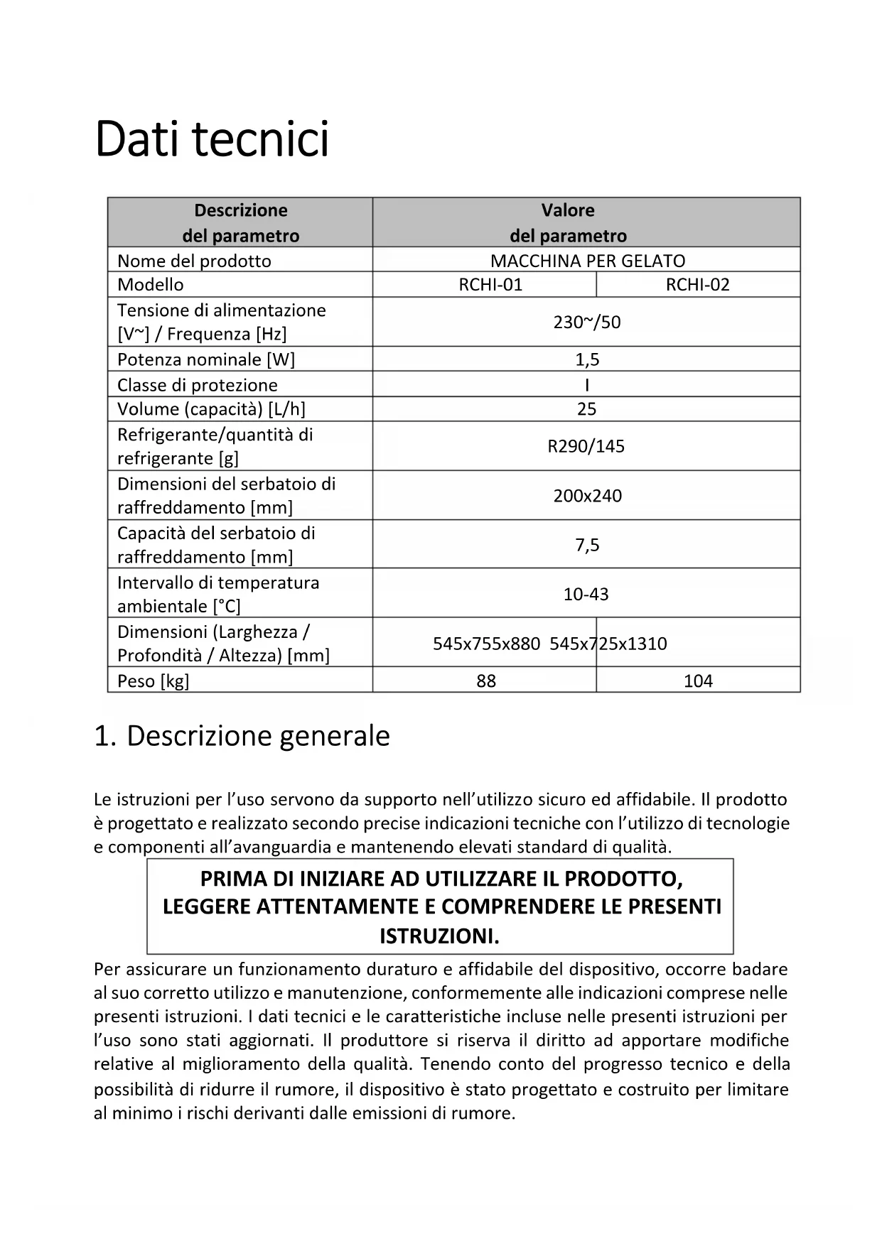 Il termine “dispositivo” o “prodotto” utilizzato nelle avvertenze e nella descrizione delle istruzioni, si riferisce alla MACCHINA PER GELATO.2.1. Sicurezza elettrica a) La spina del dispositivo deve essere compatibile con la presa. Non modificare la spina in alcun modo. Le spine originali e le prese corrispondenti riducono il rischio di folgorazione. b) Evitare di toccare oggetti messi a terra come tubi, radiatori, fornelli e frigoriferi. Il rischio di folgorazione è maggiore, se il corpo è messo a terra e tocca il dispositivo esposto a pioggia diretta, ha la superficie bagnata o è in funzionamento in un ambiente umido. La penetrazione dell’acqua nel dispositivo aumenta il rischio del suo danneggiamento e della folgorazione. c) Non utilizzare il cavo in maniera impropria. Non usare mai il cavo per trasportare il dispositivo o per estrarre la spina dalla presa. Tenere il cavo lontano da fonti di calore, olio, bordi taglienti o parti in movimento. I cavi danneggiati o aggrovigliati aumentano il rischio di folgorazione. d) Se l'uso in un ambiente umido è inevitabile, va utilizzato un differenziale (RCD). L'uso di un RCD riduce il rischio di folgorazione. e) Non utilizzare il dispositivo se il cavo di alimentazione è danneggiato o mostra evidenti segni di usura. Un cavo di alimentazione danneggiato deve essere sostituito da un elettricista qualificato o dal servizio dell’assistenza del produttore. f) Per prevenire la folgorazione, non immergere il cavo, la spina o il dispositivo stesso in acqua o altri liquidi. Non usare il dispositivo su superfici bagnate. 2.2. Sicurezza sul posto di lavoro a) Mantenere la postazione di lavoro ordinata e pulita e assicurare la sua giusta illuminazione. Il disordine o una cattiva illuminazione possono essere causa di incidenti. Occorre essere previdenti, osservare le proprie azioni e mantenere il buon senso durante l’utilizzo del dispositivo. b) Nel caso venissero osservati danni o anomalie nel funzionamento del dispositivo, bisogna spegnerlo immediatamente e segnalarlo a una persona autorizzata. c) In caso di dubbi relativi al corretto funzionamento del dispositivo, occorre contattare l’assistenza tecnica del produttore. d) Le riparazioni devono essere eseguite solo dal servizio dell’assistenza del produttore. Riparare il dispositivo in autonomia è severamente vietato! e) In caso di accensione di fuoco o incendio, per estinguere il dispositivo sotto tensione, occorre utilizzare esclusivamente estintori a polvere o ad anidride carbonica (CO2). f) Sulla postazione di lavoro non possono sostare bambini né persone non autorizzate. g) Occorre controllare regolarmente lo stato degli adesivi contenenti le informazioni relative alla sicurezza. Nel caso in cui gli adesivi si staccassero o diventassero illeggibili, occorre sostituirli.h) Conservare le istruzioni per l’uso per il loro successivo utilizzo. Se il dispositivo dovesse essere affidato ai terzi, occorre fornire loro anche le istruzioni per l’uso.