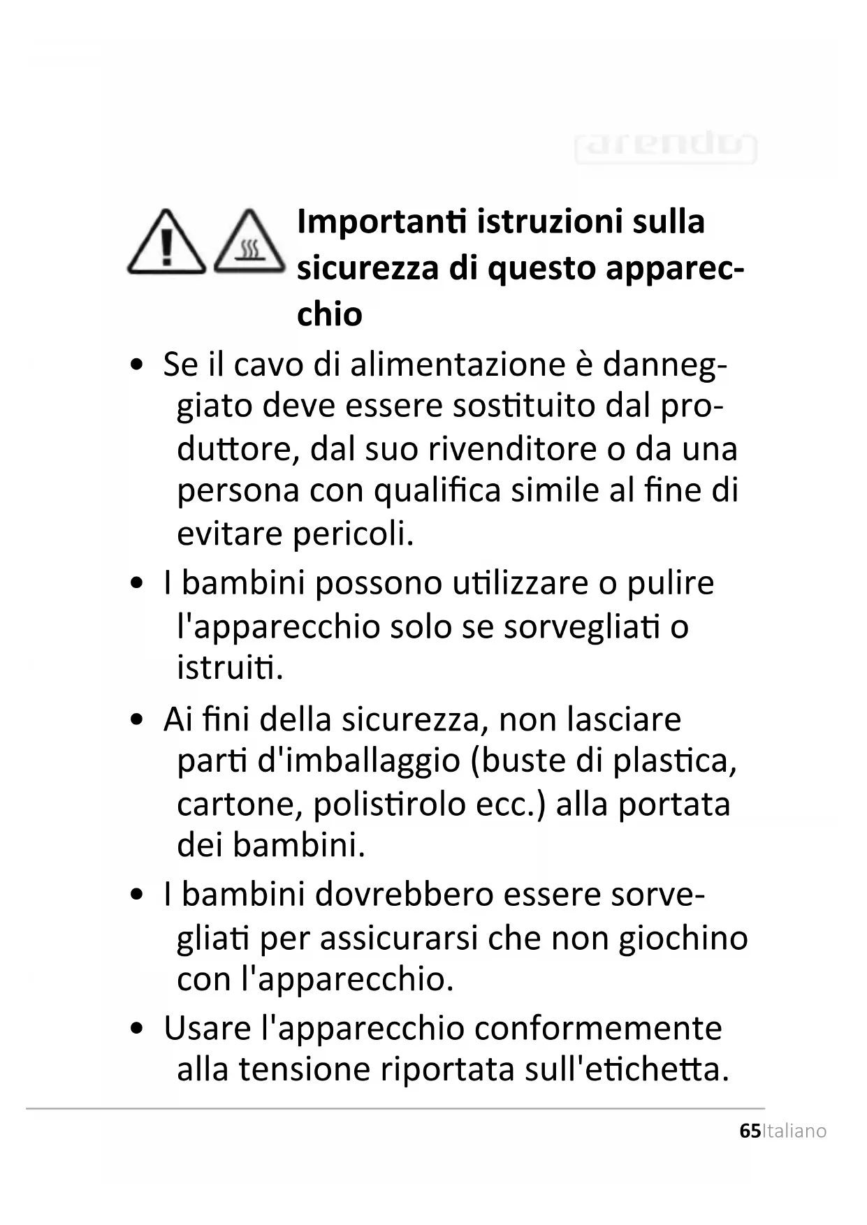 - Non coprire le uscite dell'aria sull’ap- parecchio.68 Italiano Grazie per aver scelto un prodoo di Arendo. Per ulizzare con soddisfazione il prodoo acquistato, si prega di leggere aentamente le seguen istruzioni per l'uso. Prima della messa in funzione della merce consegnata, vericare che sia integra, esente da dife e non danneggiata.