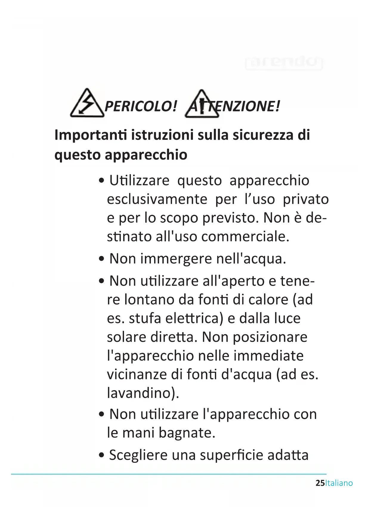 - Questo apparecchio è previ- sto per l'uso domesco e scopi simili. In parcolare può essere30 Italiano ulizzato: - in cucine per dipenden in negozi, uci e altri ambien commerciali; - in tenute agricole; - da parte di clien in alberghi, motel e altre struure abitave31Italiano Grazie per aver scelto un prodoo di Arendo. Per ulizzare con soddisfazione l'ap- parecchio acquistato a lungo, si prega di leggere aentamente le seguen brevi istruzioni per l’uso. Prima della messa in funzione della merce consegnata, verica- re che sia integra, esente da dife e non danneggiata.