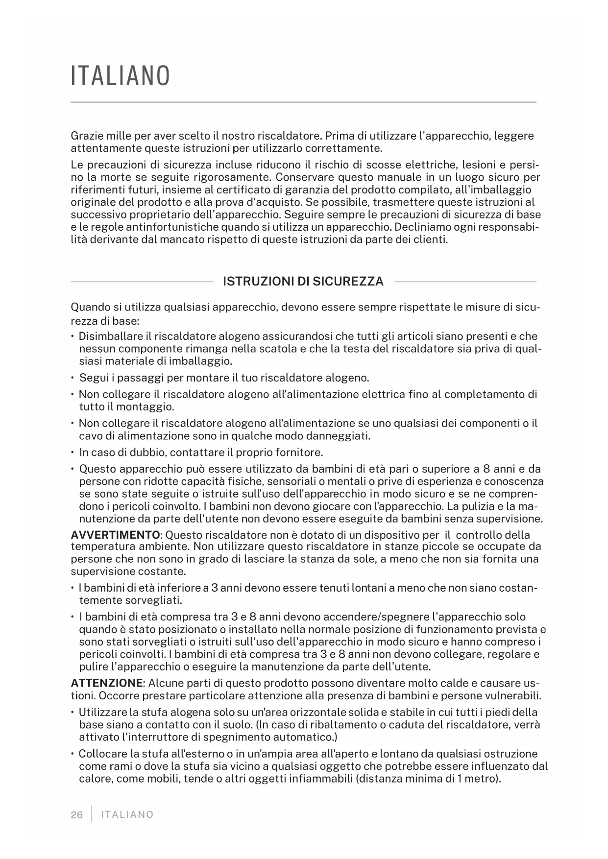 - Tout travail d'entretien ou de réparation impliquant le remplacement du tube halogène doit être effectué par un électricien qualié ou un centre de service recommandé.26 ITALIANO ITALIANO Grazie mille per aver scelto il nostro riscaldatore. Prima di utilizzare l'apparecchio, leggere attentamente queste istruzioni per utilizzarlo correttamente. Le precauzioni di sicurezza incluse riducono il rischio di scosse elettriche, lesioni e persi- no la morte se seguite rigorosamente. Conservare questo manuale in un luogo sicuro per riferimenti futuri, insieme al certicato di garanzia del prodotto compilato, all'imballaggio originale del prodotto e alla prova d'acquisto. Se possibile, trasmettere queste istruzioni al successivo proprietario dell'apparecchio. Seguire sempre le precauzioni di sicurezza di base e le regole antinfortunistiche quando si utilizza un apparecchio. Decliniamo ogni responsabi- lità derivante dal mancato rispetto di queste istruzioni da parte dei clienti.