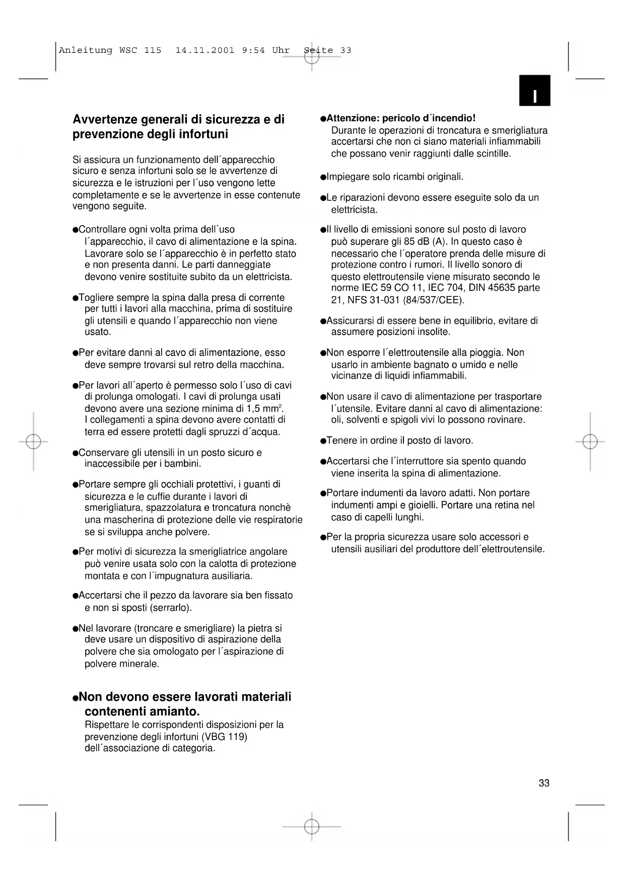 ºÏ¿ÓÙ˙· Ù·Ó‡Ûˆ˜ ¶ÂÚÈÎfi¯ÏÈÔ ÊÏ¿ÓÙ˙·˜ ¢È¿Ù·ÍË Ù˘ ÊÏ¿ÓÙ˙·˜ ηٿ ÙËÓ ¯Ú‹ÛË ›ÛÈÔ˘ ÚÈÔÓÈÔ‡ Anleitung WSC 115 14.11.2001 9:54 Uhr Seite 3233 Avvertenze generali di sicurezza e di prevenzione degli infortuni Si assicura un funzionamento dell´apparecchio sicuro e senza infortuni solo se le avvertenze di sicurezza e le istruzioni per l´uso vengono lette completamente e se le avvertenze in esse contenute vengono seguite. Controllare ogni volta prima dell´uso l´apparecchio, il cavo di alimentazione e la spina. Lavorare solo se l´apparecchio è in perfetto stato e non presenta danni. Le parti danneggiate devono venire sostituite subito da un elettricista. Togliere sempre la spina dalla presa di corrente per tutti i lavori alla macchina, prima di sostituire gli utensili e quando l´apparecchio non viene usato. Per evitare danni al cavo di alimentazione, esso deve sempre trovarsi sul retro della macchina. Per lavori all´aperto è permesso solo l´uso di cavi di prolunga omologati. I cavi di prolunga usati devono avere una sezione minima di 1,5 mm