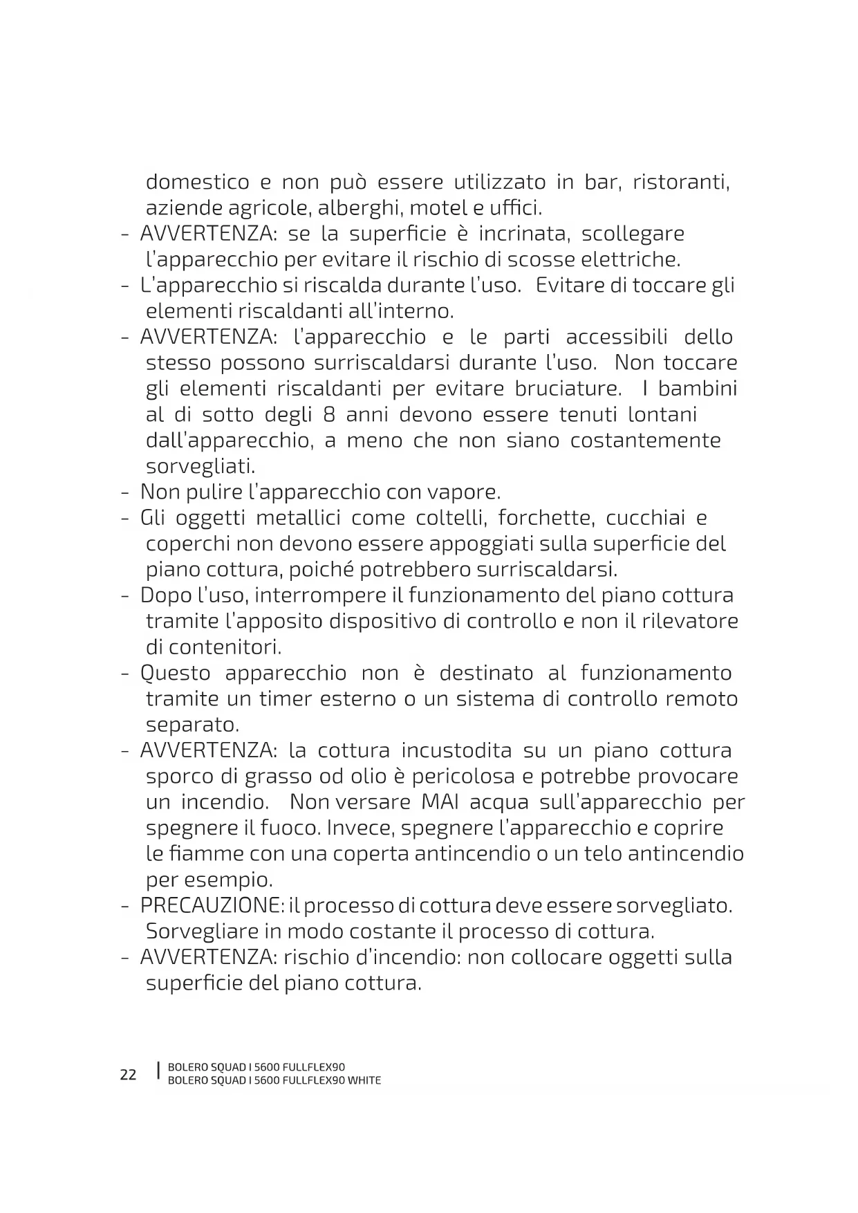 un panno o carta da cucina. Rimuovere le macchie di alimenti zuccherati fusi il prima possibile. Se lasciati rareddare sul vetro, possono essere dicili da rimuovere o possono addirittura danneggiare in modo permanente il piano cottura. Pericolo di taglio: quando il coperchio di sicurezza è retratto, la lama del raschietto può essere alata. Usare il raschietto con estrema attenzione e conservarlo sempre in modo sicuro e fuori dalla portata dei bambini.BOLERO SQUAD I 5600 FULLFLEX90