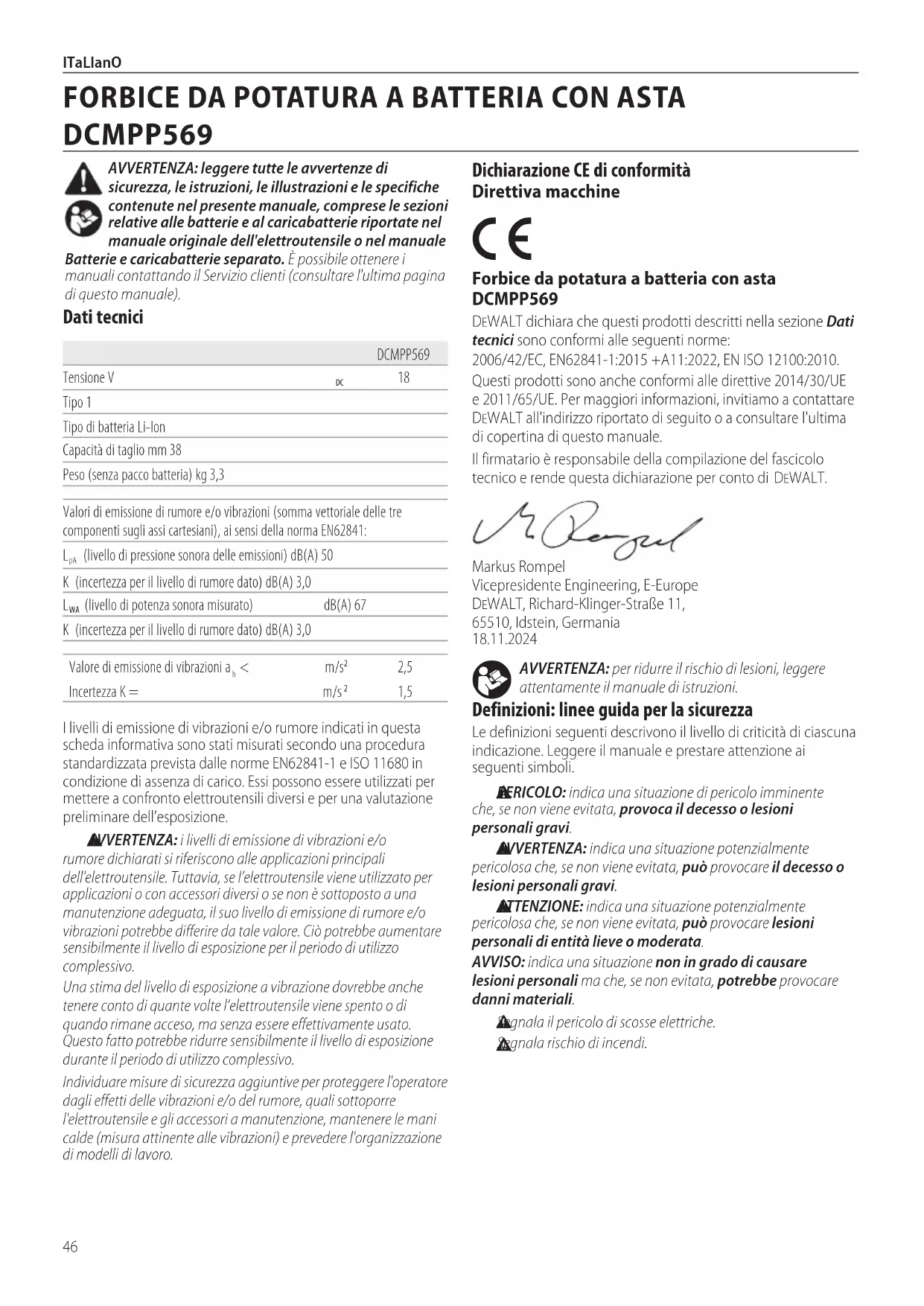 AVVERTENZA: per ridurre il rischio di lesioni, leggere attentamente il manuale diistruzioni. Definizioni: linee guida per la sicurezza Le definizioni seguenti descrivono il livello di criticità di ciascuna indicazione. Leggere il manuale e prestare attenzione ai seguentisimboli. PERICOLO: indica una situazione di pericolo imminente che, se non viene evitata, provoca il decesso o lesioni personaligravi. AVVERTENZA: indica una situazione potenzialmente pericolosa che, se non viene evitata, può provocare il decesso o lesioni personaligravi. ATTENZIONE: indica una situazione potenzialmente pericolosa che, se non viene evitata, può provocare lesioni personali di entità lieve omoderata. AVVISO: indica una situazione non in grado di causare lesioni personali ma che, se non evitata, potrebbe provocare dannimateriali. Segnala il pericolo di scosseelettriche. Segnala rischio diincendi. Dichiarazione CE di conformità Direttiva macchine Forbice da potatura a batteria con asta DCMPP569 DeWALT dichiara che questi prodotti descritti nella sezione Dati tecnici sono conformi alle seguenti norme: 2006/42/EC, EN62841-1:2015 +A11:2022, EN ISO 12100:2010.Questi prodotti sono anche conformi alle direttive 2014/30/UE e 2011/65/UE. Per maggiori informazioni, invitiamo a contattare DeWALT all'indirizzo riportato di seguito o a consultare l'ultima di copertina di questomanuale.Il firmatario è responsabile della compilazione del fascicolo tecnico e rende questa dichiarazione per conto diDeWALT.Markus Rompel Vicepresidente Engineering, E-Europe DeWALT, Richard-Klinger-Straße 11, 65510, Idstein, Germania 18.11.2024I livelli di emissione di vibrazioni e/o rumore indicati in questa scheda informativa sono stati misurati secondo una procedura standardizzata prevista dalle norme EN62841-1 e ISO 11680 in condizione di assenza di carico. Essi possono essere utilizzati per mettere a confronto elettroutensili diversi e per una valutazione preliminare dell’esposizione. AVVERTENZA: i livelli di emissione di vibrazioni e/o rumore dichiarati si riferiscono alle applicazioni principali dell'elettroutensile. Tuttavia, se l’elettroutensile viene utilizzato per applicazioni o con accessori diversi o se non è sottoposto a una manutenzione adeguata, il suo livello di emissione di rumore e/o vibrazioni potrebbe differire da tale valore. Ciò potrebbe aumentare sensibilmente il livello di esposizione per il periodo di utilizzo complessivo.Una stima del livello di esposizione a vibrazione dovrebbe anche tenere conto di quante volte l’elettroutensile viene spento o di quando rimane acceso, ma senza essere effettivamente usato. Questo fatto potrebbe ridurre sensibilmente il livello di esposizione durante il periodo di utilizzo complessivo.Individuare misure di sicurezza aggiuntive per proteggere l'operatore dagli effetti delle vibrazioni e/o del rumore, quali sottoporre l'elettroutensile e gli accessori a manutenzione, mantenere le mani calde (misura attinente alle vibrazioni) e prevedere l'organizzazione di modelli dilavoro.DCMPP569Tensione V