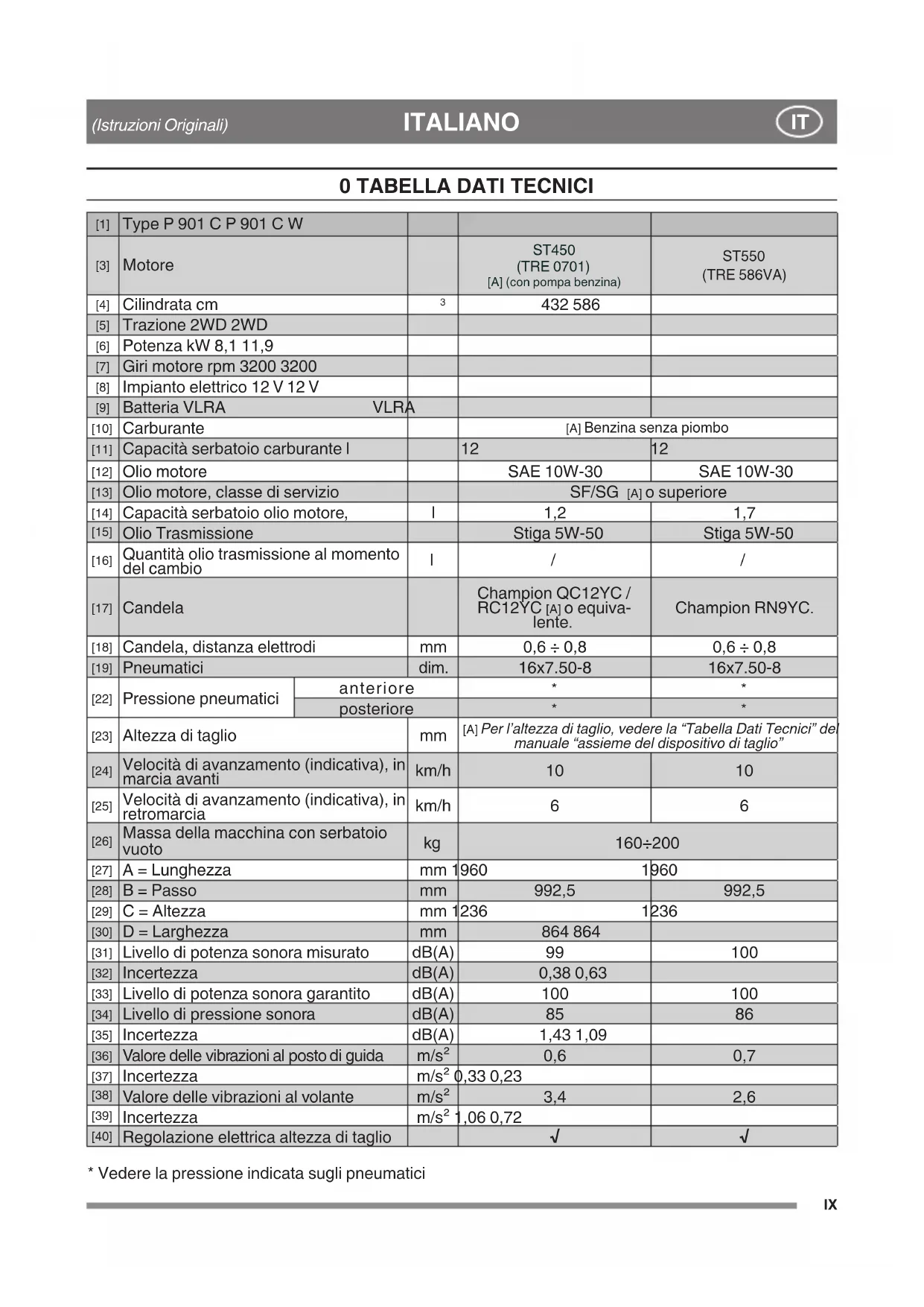 [5] Trazione 2WD 2WD [6] Potenza kW 8,1 11,9 [7] Giri motore rpm 3200 3200 [8] Impianto elettrico 12 V 12 V [9] Batteria VLRA VLRA [10] Carburante [A] Benzina senza piombo [11] Capacità serbatoio carburante l 12 12 [12] Olio motore SAE 10W-30 SAE 10W-30 [13] Olio motore, classe di servizio SF/SG [A] o superiore [14] Capacità serbatoio olio motore, l 1,2 1,7 [15] Olio Trasmissione Stiga 5W-50 Stiga 5W-50 [16] Quantità olio trasmissione al momento del cambio l / / [17] Candela Champion QC12YC / RC12YC [A] o equiva- lente. Champion RN9YC. [18] Candela, distanza elettrodi mm 0,6 ÷ 0,8 0,6 ÷ 0,8 [19] Pneumatici dim. 16x7.50-8 16x7.50-8 [22] Pressione pneumatici anteriore