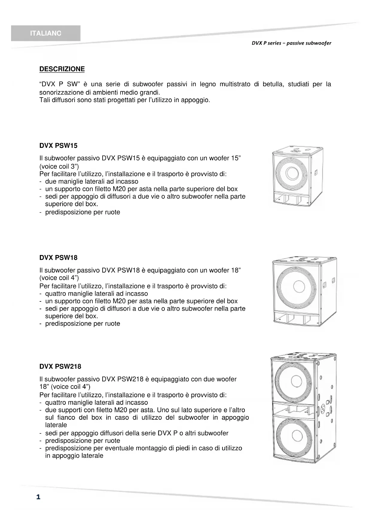 DVX PSW218 Il subwoofer passivo DVX PSW218 è equipaggiato con due woofer 18” (voice coil 4”) Per facilitare l’utilizzo, l’installazione e il trasporto è provvisto di: - quattro maniglie laterali ad incasso - due supporti con filetto M20 per asta. Uno sul lato superiore e l’altro sul fianco del box in caso di utilizzo del subwoofer in appoggio laterale - sedi per appoggio diffusori della serie DVX P o altri subwoofer - predisposizione per ruote - predisposizione per eventuale montaggio di piedi in caso di utilizzo in appoggio lateraleITALIANO