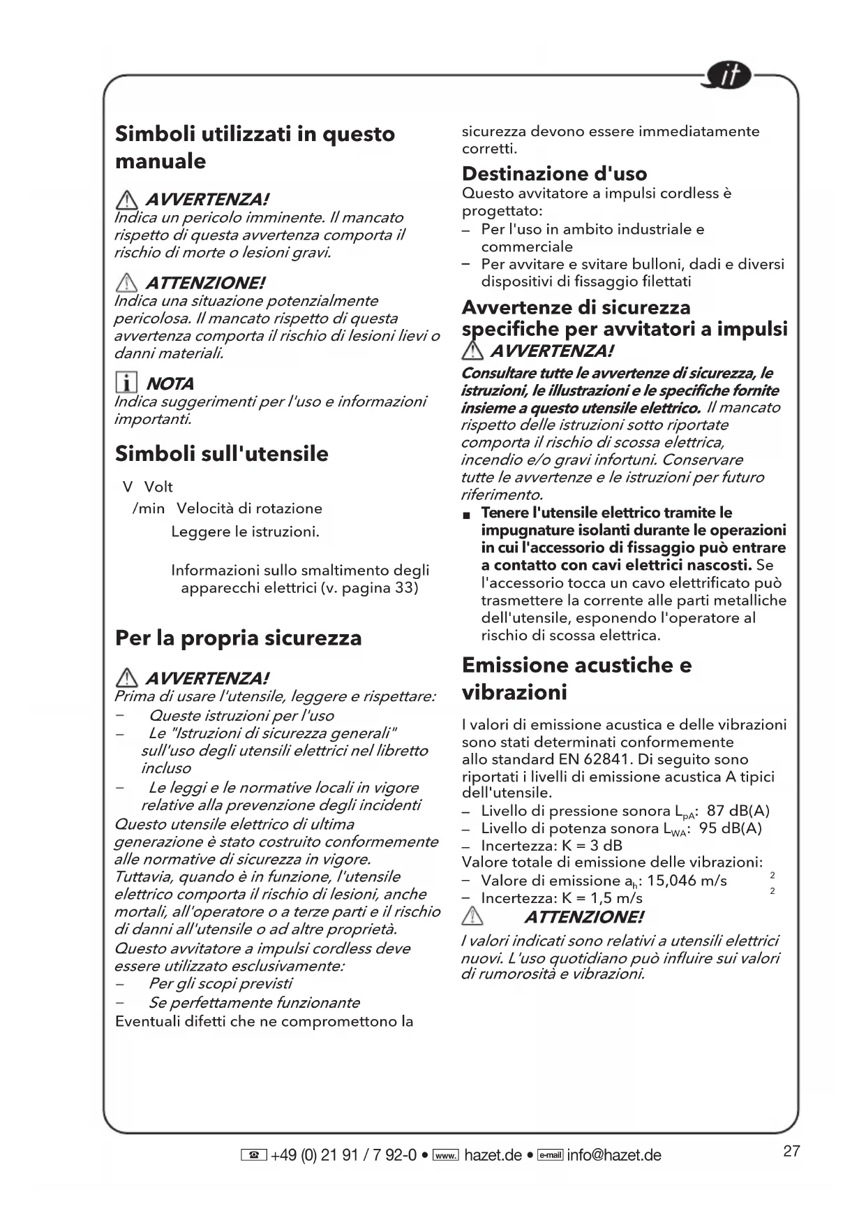 +49 (0) 21 91 / 7 92-0 • hazet.de • info@hazet.de Simboli utilizzati in questo manuale AVVERTENZA! Indica un pericolo imminente. Il mancato rispetto di questa avvertenza comporta il rischio di morte o lesioni gravi. ATTENZIONE! Indica una situazione potenzialmente pericolosa. Il mancato rispetto di questa avvertenza comporta il rischio di lesioni lievi o danni materiali. NOTA Indica suggerimenti per l'uso e informazioni importanti. Simboli sull'utensile V Volt/min Velocità di rotazione Leggere le istruzioni. Informazioni sullo smaltimento degli apparecchi elettrici (v. pagina 33) Per la propria sicurezza AVVERTENZA! Prima di usare l'utensile, leggere e rispettare: Queste istruzioni per l'uso Le "Istruzioni di sicurezza generali" sull'uso degli utensili elettrici nel libretto incluso Le leggi e le normative locali in vigore relative alla prevenzione degli incidenti Questo utensile elettrico di ultima generazione è stato costruito conformemente alle normative di sicurezza in vigore.Tuttavia, quando è in funzione, l'utensile elettrico comporta il rischio di lesioni, anche mortali, all'operatore o a terze parti e il rischio di danni all'utensile o ad altre proprietà.Questo avvitatore a impulsi cordless deve essere utilizzato esclusivamente: Per gli scopi previsti Se perfettamente funzionanteEventuali difetti che ne compromettono la sicurezza devono essere immediatamente corret ti. Destinazione d'uso Questo avvitatore a impulsi cordless è progettato: Per l'uso in ambito industriale ecommerciale Per avvitare e svitare bulloni, dadi e diversidispositivi di fissaggio filettati Avvertenze di sicurezza specifiche per avvitatori a impulsi AVVERTENZA! Consultare tutte le avvertenze di sicurezza, le istruzioni, le illustrazioni e le specifiche fornite insieme a questo utensile elettrico. Il mancato rispetto delle istruzioni sotto riportate comporta il rischio di scossa elettrica, incendio e/o gravi infortuni. Conservare tutte le avvertenze e le istruzioni per futuro riferimento. Tenere l'utensile elettrico tramite le impugnature isolanti durante le operazioni in cui l'accessorio di ssaggio può entrarea contatto con cavi elettrici nascosti. Sel'accessorio tocca un cavo elettricato puòtrasmettere la corrente alle parti metallichedell'utensile, esponendo l'operatore alrischio di scossa elettrica. Emissione acustiche e vibrazioni I valori di emissione acustica e delle vibrazioni sono stati determinati conformemente allo standard EN 62841. Di seguito sono riportati i livelli di emissione acustica A tipici dell'utensile. Livello di pressione sonora L : 87 dB(A) Livello di potenza sonora L : 95 dB(A) Incertezza: K = 3 dBValore totale di emissione delle vibrazioni: Valore di emissione a : 15,046 m/s