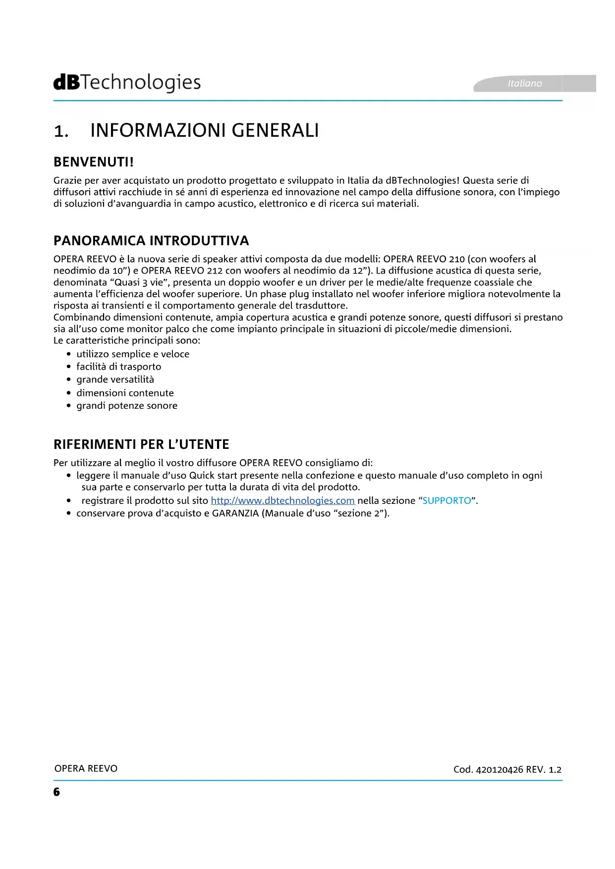 BENVENUTI! Grazie per aver acquistato un prodotto progettato e sviluppato in Italia da dBTechnologies! Questa serie di diffusori attivi racchiude in sé anni di esperienza ed innovazione nel campo della diffusione sonora, con l’impiego di soluzioni d’avanguardia in campo acustico, elettronico e di ricerca sui materiali. PANORAMICA INTRODUTTIVA OPERA REEVO è la nuova serie di speaker attivi composta da due modelli: OPERA REEVO 210 (con woofers al neodimio da 10”) e OPERA REEVO 212 con woofers al neodimio da 12”). La diffusione acustica di questa serie, denominata “Quasi 3 vie”, presenta un doppio woofer e un driver per le medie/alte frequenze coassiale che aumenta l’efficienza del woofer superiore. Un phase plug installato nel woofer inferiore migliora notevolmente la risposta ai transienti e il comportamento generale del trasduttore. Combinando dimensioni contenute, ampia copertura acustica e grandi potenze sonore, questi diffusori si prestano sia all’uso come monitor palco che come impianto principale in situazioni di piccole/medie dimensioni. Le caratteristiche principali sono: