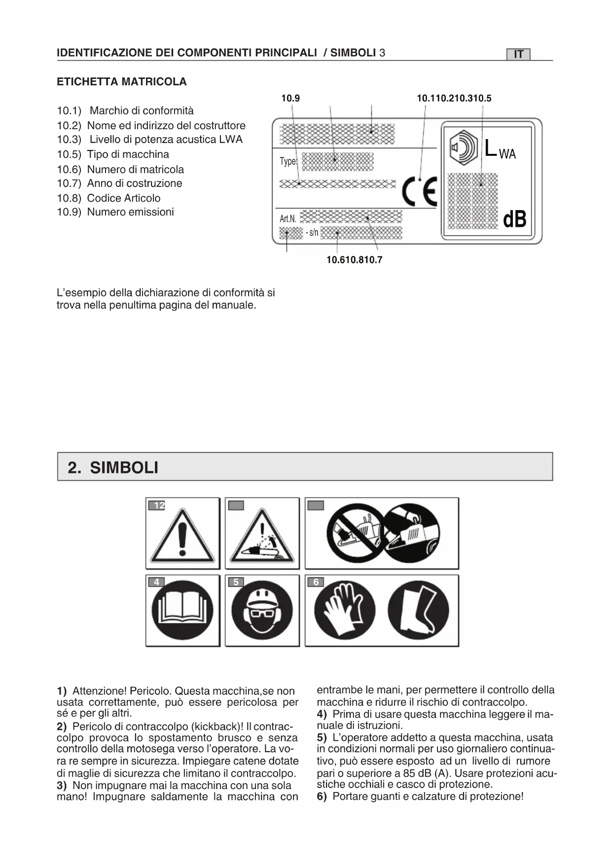 5) L'operaatore addetto a questa macchina, usata in condizioni normali per uso giornaliero continuativo, cui quod esposto ad un livello di rumore pari o superiore a 85 dB (A). Usare protezioni acustiche occhiali e casco di protezione.