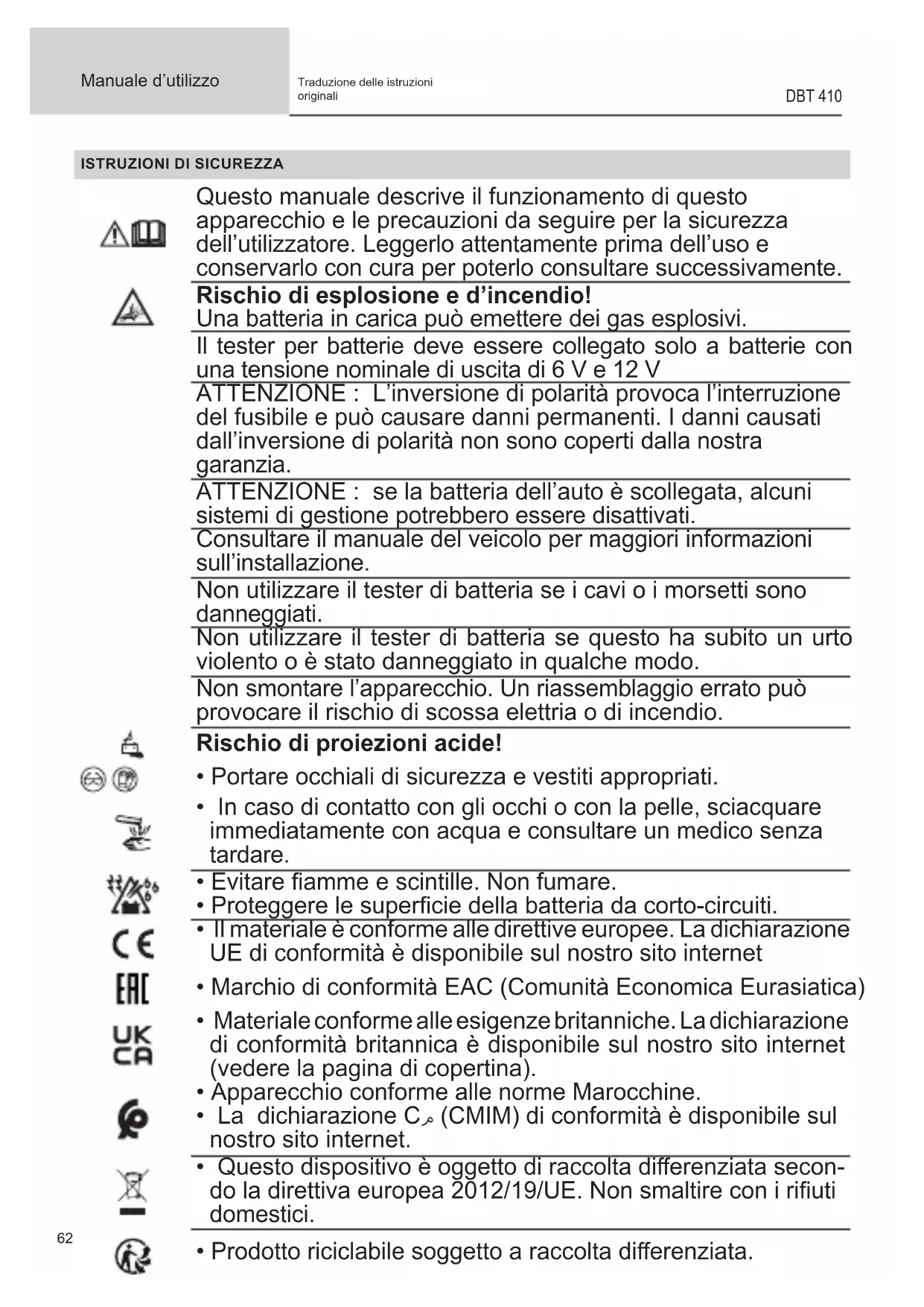 Manuale d’utilizzo DBT 410 Traduzione delle istruzioni originaliRISULTATI DEL TEST DELLA BATTERIA STD : 500 A CCA 654 A