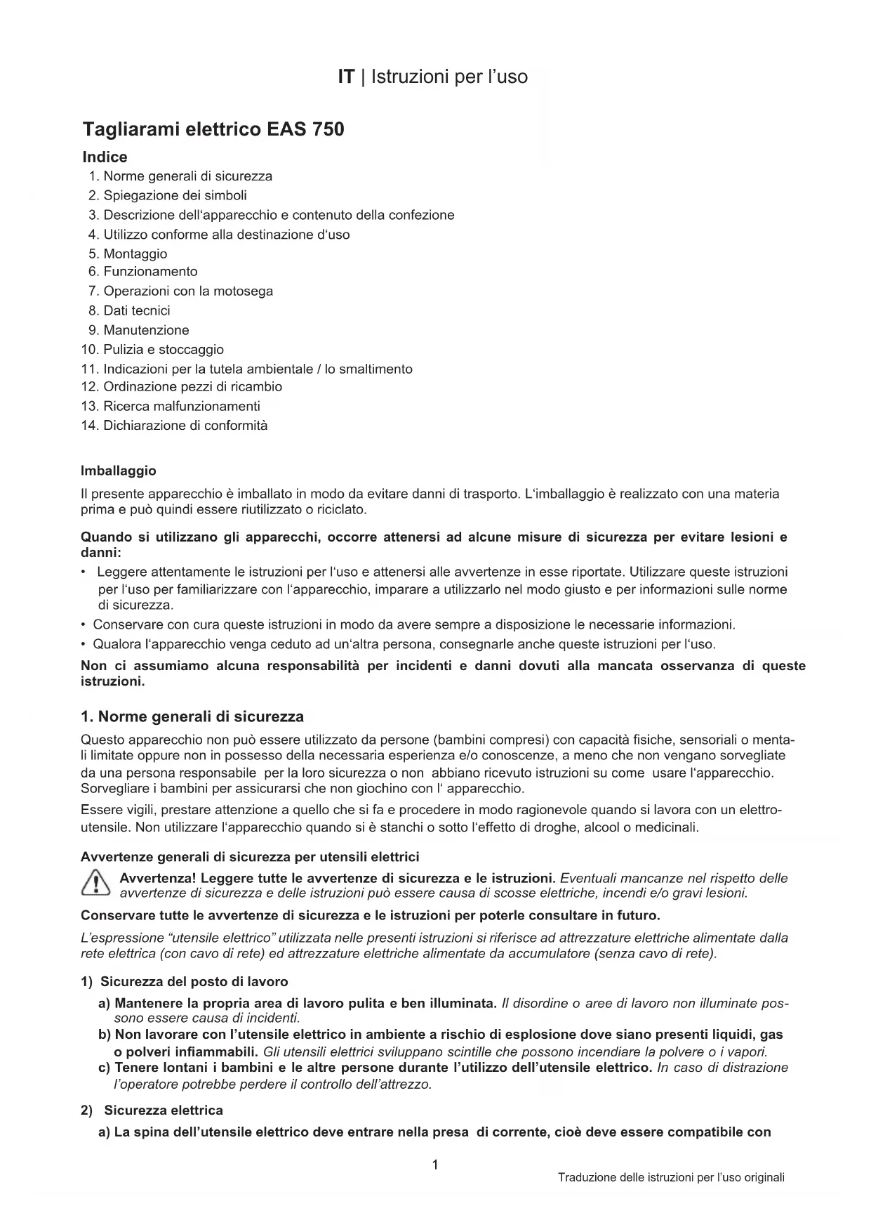 Elektro-Astsäge EAS 750 Tensione delle rete 230-240 V ~ / 50 Hz Potenza nominale 750 W Numero di giri a vuoto 6000 min