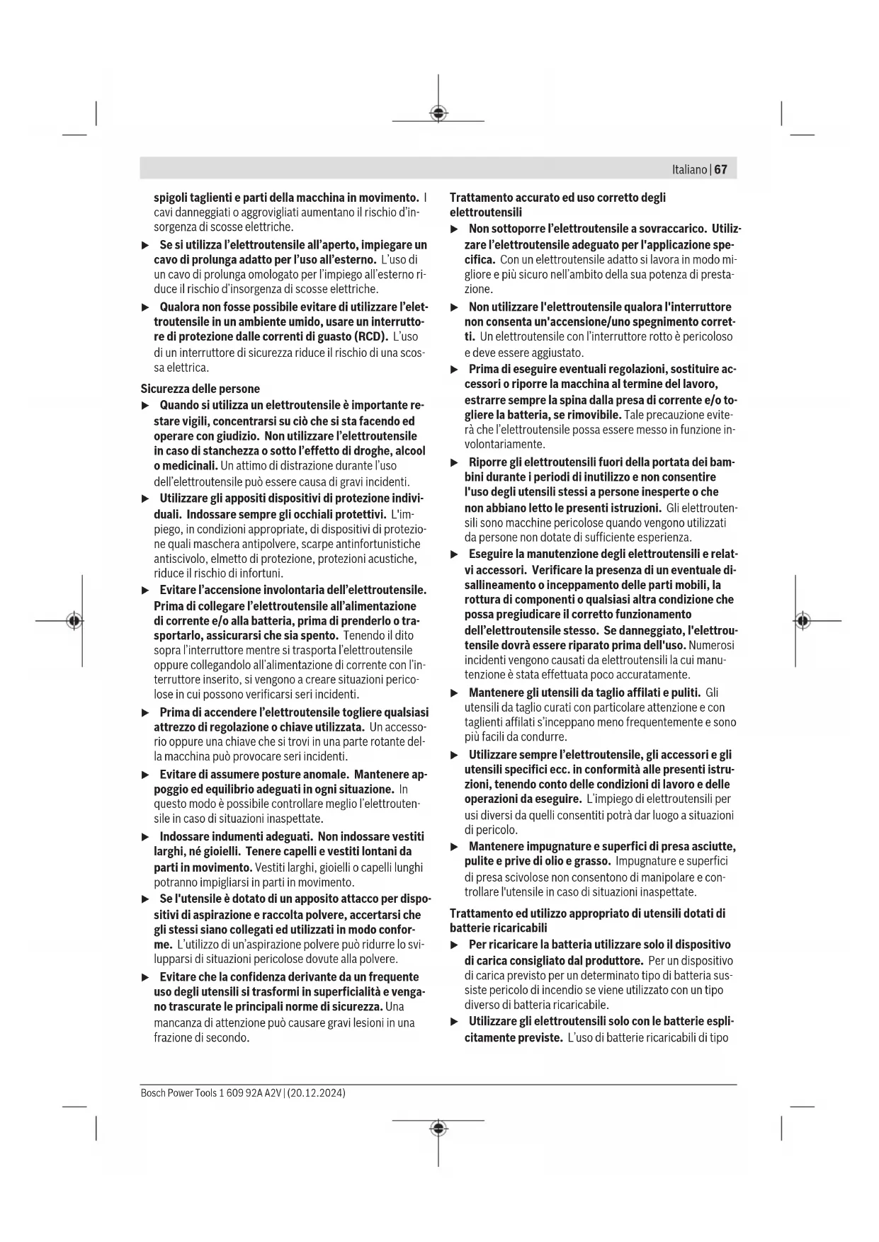 per lo stoccaggio °C −20…+50 Batterie consigliate GBA 18V… ProCORE18V… Caricabatteria consigliati GAL 18… GAX 18… GAL 36… Dimensioni delle lame idonee Diametro max. della lama D mm 355 Spessore del corpo lama mm 1,8–2,5 Diametro di foratura d mm 25,4 A) Peso senza batteria (Per il peso della batteria, consultare il sito http://www.bosch-professional.com) B) Prestazioni limitate con temperature < 0 °C I valori possono variare a seconda del prodotto ed essere soggetti a condizioni di impiego e ambientali. Per maggiori informazioni, consul- tare il sito www.bosch-professional.com/wac. Informazioni sulla rumorosità Valori di emissione acustica rilevati conformemente aENIEC62841-1. Il livello di rumorosità ponderato A dell’elettroutensile è tipi- camente di: Livello di pressione acustica 91dB(A); Livello di potenza sonora 100dB(A). Grado d’incertezza K=3dB. Indossare protezioni acustiche! Il livello di emissione acustica indicato nelle presenti istruzio- ni è stato rilevato in conformità ad una procedura di misura- zione standardizzata e può essere utilizzato per eseguire un confronto tra gli elettroutensili. La stessa procedura è ido- nea anche per una valutazione temporanea dell’emissione acustica. Il livello di emissione acustica indicato è riferito agli impieghi principali dell’elettroutensile. Qualora l’elettroutensile venis- se utilizzato tuttavia per altre applicazioni, con accessori dif- ferenti oppure con manutenzione insufficiente, il livello di emissione acustica potrebbe variare. Ciò potrebbe aumenta- re sensibilmente l’emissione acustica per l’intero periodo di funzionamento. 1 609 92A A2V | (20.12.2024) Bosch Power ToolsItaliano | 73 Per una valutazione precisa dell’emissione acustica bisogne- rebbe considerare anche i tempi in cui l’utensile è spento op- pure è acceso ma non viene effettivamente utilizzato. Ciò po- trebbe ridurre sensibilmente l’emissione acustica per l’intero periodo di funzionamento. Batteria Bosch vende elettroutensili a batteria anche senza batteria. Per sapere se nella dotazione dell’elettroutensile è compresa una batteria, leggere quanto riportato sulla confezione. Ricarica della batteria u Utilizzare esclusivamente i caricabatterie indicati nei dati tecnici. Soltanto questi caricabatterie sono adatti al- le batterie al litio utilizzate nell’elettroutensile. Avvertenza: a causa delle norme internazionali per il tra- sporto, le batterie al litio vengono fornite parzialmente cari- che. Per assicurare la piena potenza della batteria, ricaricar- la completamente prima dell’impiego iniziale. Introduzione della batteria Spingere la batteria carica nell’apposito alloggiamento, sino a farlo scattare udibilmente in posizione. Rimozione della batteria Per rimuovere la batteria, premere il tasto di sbloccaggio ed estrarla. Durante tale operazione, non esercitare forza. La batteria è dotata di 2livelli di bloccaggio, preposti ad im- pedire che la batteria stessa cada all’esterno, qualora il tasto di sbloccaggio batteria venga premuto inavvertitamente. Si- no a quando la batteria è inserita nell’elettroutensile, essa viene mantenuta in posizione da un’apposita molla. Indicatore del livello di carica della batteria Avvertenza: non tutti i tipi di batteria dispongono di un indi- catore del livello di carica. I LED verdi dell’apposito indicatore indicano il livello di cari- ca della batteria. Per ragioni di sicurezza, il livello di carica si può verificare esclusivamente ad elettroutensile fermo. Per visualizzare il livello di carica, premere il tasto dell’indi- catore livello di carica della batteria o . Ciò sarà possibi- le anche a batteria rimossa. Se premuto il tasto dell’indicatore livello di carica della batte- ria non si illumina alcun LED, ciò significa che la batteria è di- fettosa e che deve essere sostituita. Tipo di batteria GBA 18V... LED Capacità Luce fissa, 3 LED verdi 60–100% Luce fissa, 2 LED verdi 30–60% Luce fissa, 1 LED verde 5–30% Luce lampeggiante, 1 LED verde 0–5% Tipo di batteria ProCORE18V... LED Capacità Luce fissa, 5 LED verdi 80–100% Luce fissa, 4 LED verdi 60–80% Luce fissa, 3 LED verdi 40–60% Luce fissa, 2 LED verdi 20–40% Luce fissa, 1 LED verde 5–20% Luce lampeggiante, 1 LED verde 0–5% Avvertenze per l’impiego ottimale della batteria Proteggere la batteria ricaricabile da umidità ed acqua. Conservare la batteria esclusivamente nel campo di tempe- ratura fra −20 °C e 50°C. Non lasciare la batteria all’interno dell’auto, ad es. nel periodo estivo. Pulire di tanto in tanto le fessure di ventilazione della batte- ria ricaricabile con un pennello morbido, pulito ed asciutto. Una sensibile riduzione della durata del funzionamento dopo l’operazione di ricarica sta ad indicare che la batteria ricari- cabile dovrà essere sostituita. Attenersi alle indicazioni relative allo smaltimento. Montaggio u Prima di qualsiasi intervento sull’elettroutensile (ad es. per manutenzione, sostituzione dell’accessorio ecc.), prelevare la batteria. Qualora l’interruttore di av- vio/arresto venga premuto inavvertitamente, vi è rischio di lesioni. Volume di fornitura – Prelevare con cautela dai relativi imballaggi tutti gli ele- menti forniti in dotazione. – Rimuovere dall’elettroutensile e dagli accessori forniti in dotazione tutto il materiale di imballaggio. Prima di mettere in funzione l’elettroutensile per la prima volta, accertarsi che siano effettivamente presenti tutte le parti riportate di seguito: – Troncatrice per metallo a batteria con lama installata – Chiave a brugola (11) – Morsetto per tubi (20) Avvertenza: Verificare che l’elettroutensile non presenti danni. Prima di ogni utilizzo dell’elettroutensile, esaminare accura- tamente i dispositivi di protezione o eventuali parti lievemen- te danneggiate, per accertarsi che funzionino correttamente. Verificare che le parti mobili funzionino perfettamente e che non si bl