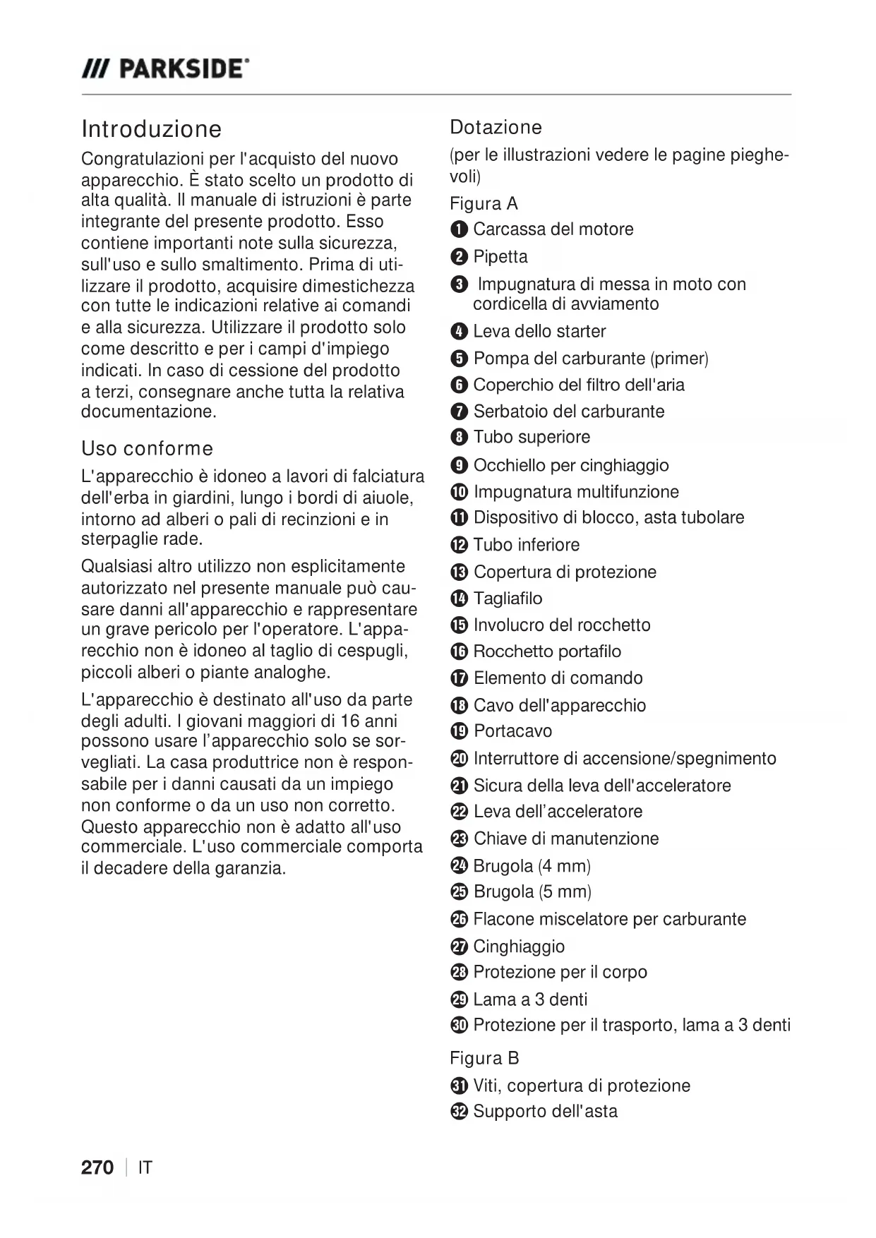 ֺIT Introduzione Congratulazioni per l'acquisto del nuovo apparecchio. È stato scelto un prodotto di alta qualità. Il manuale di istruzioni è parte integrante del presente prodotto. Esso contiene importanti note sulla sicurezza, sull'uso e sullo smaltimento. Prima di uti- lizzare il prodotto, acquisire dimestichezza con tutte le indicazioni relative ai comandi e alla sicurezza. Utilizzare il prodotto solo come descritto e per i campi d'impiego indicati. In caso di cessione del prodotto a terzi, consegnare anche tutta la relativa documentazione. Uso conforme L'apparecchio è idoneo a lavori di falciatura dell'erba in giardini, lungo i bordi di aiuole, intorno ad alberi o pali di recinzioni e in sterpaglie rade. Qualsiasi altro utilizzo non esplicitamente autorizzato nel presente manuale può cau- sare danni all'apparecchio e rappresentare un grave pericolo per l'operatore. L'appa- recchio non è idoneo al taglio di cespugli, piccoli alberi o piante analoghe. L'apparecchio è destinato all'uso da parte degli adulti. I giovani maggiori di 16 anni possono usare l’apparecchio solo se sor- vegliati. La casa produttrice non è respon- sabile per i danni causati da un impiego non conforme o da un uso non corretto. Questo apparecchio non è adatto all'uso commerciale. L'uso commerciale comporta il decadere della garanzia. Dotazione (per le illustrazioni vedere le pagine pieghe- voli) Figura A 1 Carcassa del motore 2 Pipetta 3 Impugnatura di messa in moto con cordicella di avviamento 4 Leva dello starter 5 Pompa del carburante (primer) 6 &RSHUFKLRGHOƞOWURGHOODULD 7 Serbatoio del carburante 8 Tubo superiore 9 2FFKLHOORSHUFLQJKLDJJLR 0 Impugnatura multifunzione q Dispositivo di blocco, asta tubolare w Tubo inferiore e Copertura di protezione r7DJOLDƞOR t Involucro del rocchetto z 5RFFKHWWRSRUWDƞOR u Elemento di comando i Cavo dell'apparecchio o Portacavo p Interruttore di accensione/spegnimento a Sicura della leva dell'acceleratore s Leva dell’acceleratore d Chiave di manutenzione