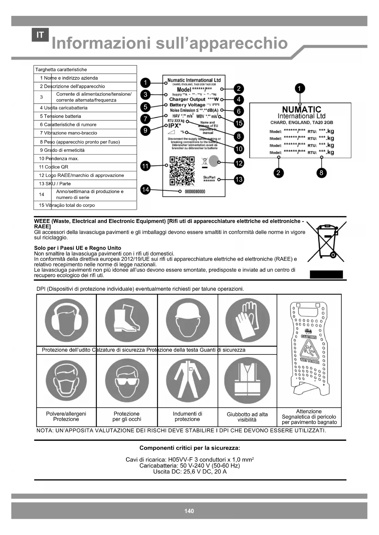 Caricabatteria: 50 V-240 V (50-60 Hz) Uscita DC: 25,6 V DC, 20 A Protezione dell’udito Calzature di sicurezza Protezione della testa Guanti di sicurezza Polvere/allergeni Protezione Protezione per gli occhi Indumenti di protezione Giubbotto ad alta visibilità Attenzione Segnaletica di pericolo per pavimento bagnato DPI (Dispositivi di protezione individuale) eventualmente richiesti per talune operazioni. NOTA: UN’APPOSITA VALUTAZIONE DEI RISCHI DEVE STABILIRE I DPI CHE DEVONO ESSERE UTILIZZATI. Targhetta caratteristiche1 Nome e indirizzo azienda2 Descrizione dell'apparecchio Corrente di alimentazione/tensione/corrente alternata/frequenza4 Uscita caricabatteria5 Tensione batteria6 Caratteristiche di rumore7 Vibrazione mano-braccio8 Peso (apparecchio pronto per l'uso)9 Grado di ermeticità10 Pendenza max.11 Codice QR12 Logo RAEE/marchio di approvazione13 SKU / Parte Anno/settimana di produzione e numero di serie15 Vibração total do corpo