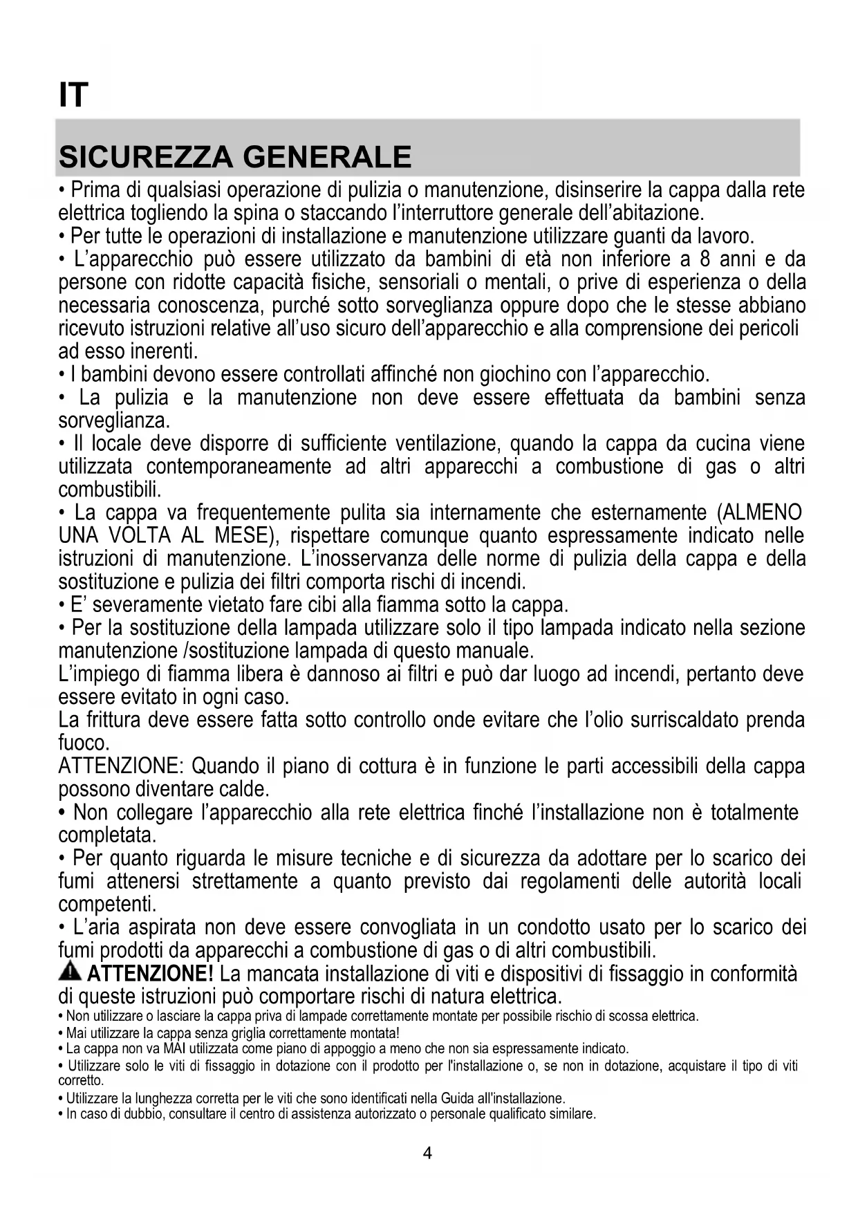 - Per la sostituzione della lampada utilizzare solo il tipo lampada indicato nella sezione manutenzione /sostituzione lampada di questo manuale. L’impiego di fiamma libera è dannoso ai filtri e può dar luogo ad incendi, pertanto deve essere evitato in ogni caso. La frittura deve essere fatta sotto controllo onde evitare che l’olio surriscaldato prenda fuoco. ATTENZIONE: Quando il piano di cottura è in funzione le parti accessibili della cappa possono diventare calde.