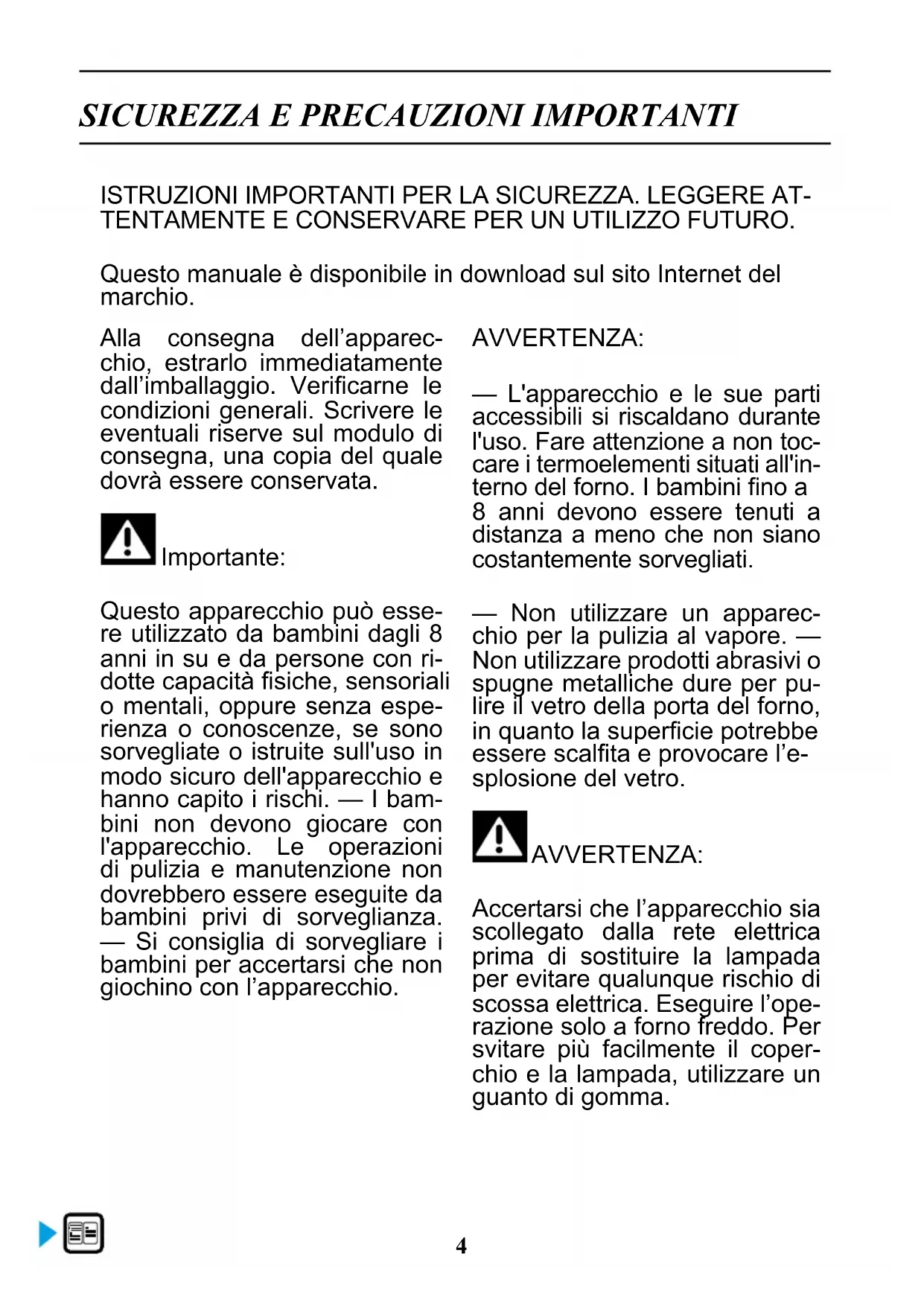 Questo apparecchio既可以 essere utilizzato da bambini dagli 8 anni in su e da persone con ridotte capacità fisiche, sensoriali o mentali, oppureenza espertienza o conoscenze, se sono sorvegliate o struite sull'uso in modo sicuro dell'apparecchio e hanno capito i rischi. — I bambini non devono gliocare con l'apparecchio. Le operazioni di pulizia e manutenzione non dovrebbero essere eseguite da bambini privi di sorveglianza. — Si consiglia di sorvegliare i bambini per accertarsi che non giochino con l'apparecchio.