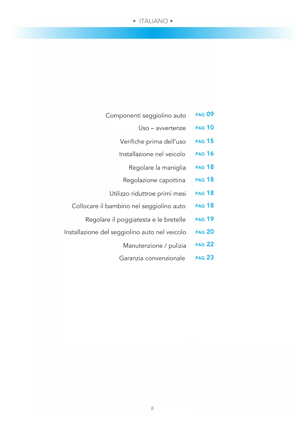 pag 09 pag 10 pag 15 pag 16 pag 18 pag 18 pag 18 pag 18 pag 19 pag 20 pag 22 pag 23 Componenti seggiolino auto Uso – avvertenze Veriche prima dell’uso Installazione nel veicolo Regolare la maniglia Regolazione capottina Utilizzo riduttroe primi mesi Collocare il bambino nel seggiolino auto Regolare il poggiatesta e le bretelle Installazione del seggiolino auto nel veicolo Manutenzione / pulizia Garanzia convenzionale• ITALIANO •