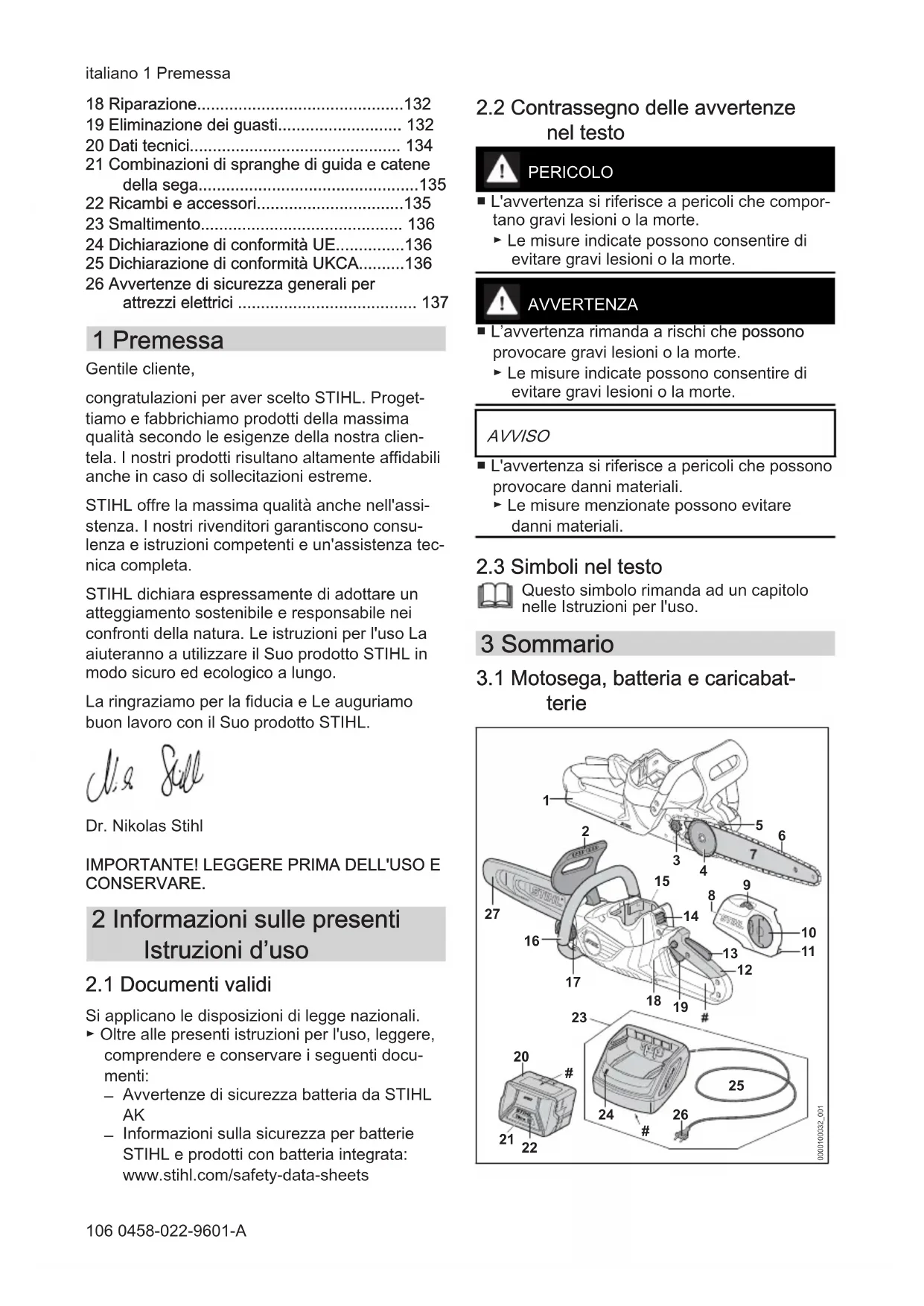 - 26 Avvertenze di sicurezza generali per attrezzi elettrici 1 Premessa Gentile cliente, congratulazioni per aver scelto STIHL. Proget‐ tiamo e fabbrichiamo prodotti della massima qualità secondo le esigenze della nostra clien‐ tela. I nostri prodotti risultano altamente affidabili anche in caso di sollecitazioni estreme. STIHL offre la massima qualità anche nell'assi‐ stenza. I nostri rivenditori garantiscono consu‐ lenza e istruzioni competenti e un'assistenza tec‐ nica completa. STIHL dichiara espressamente di adottare un atteggiamento sostenibile e responsabile nei confronti della natura. Le istruzioni per l'uso La aiuteranno a utilizzare il Suo prodotto STIHL in modo sicuro ed ecologico a lungo. La ringraziamo per la fiducia e Le auguriamo buon lavoro con il Suo prodotto STIHL. Dr. Nikolas Stihl p. 137