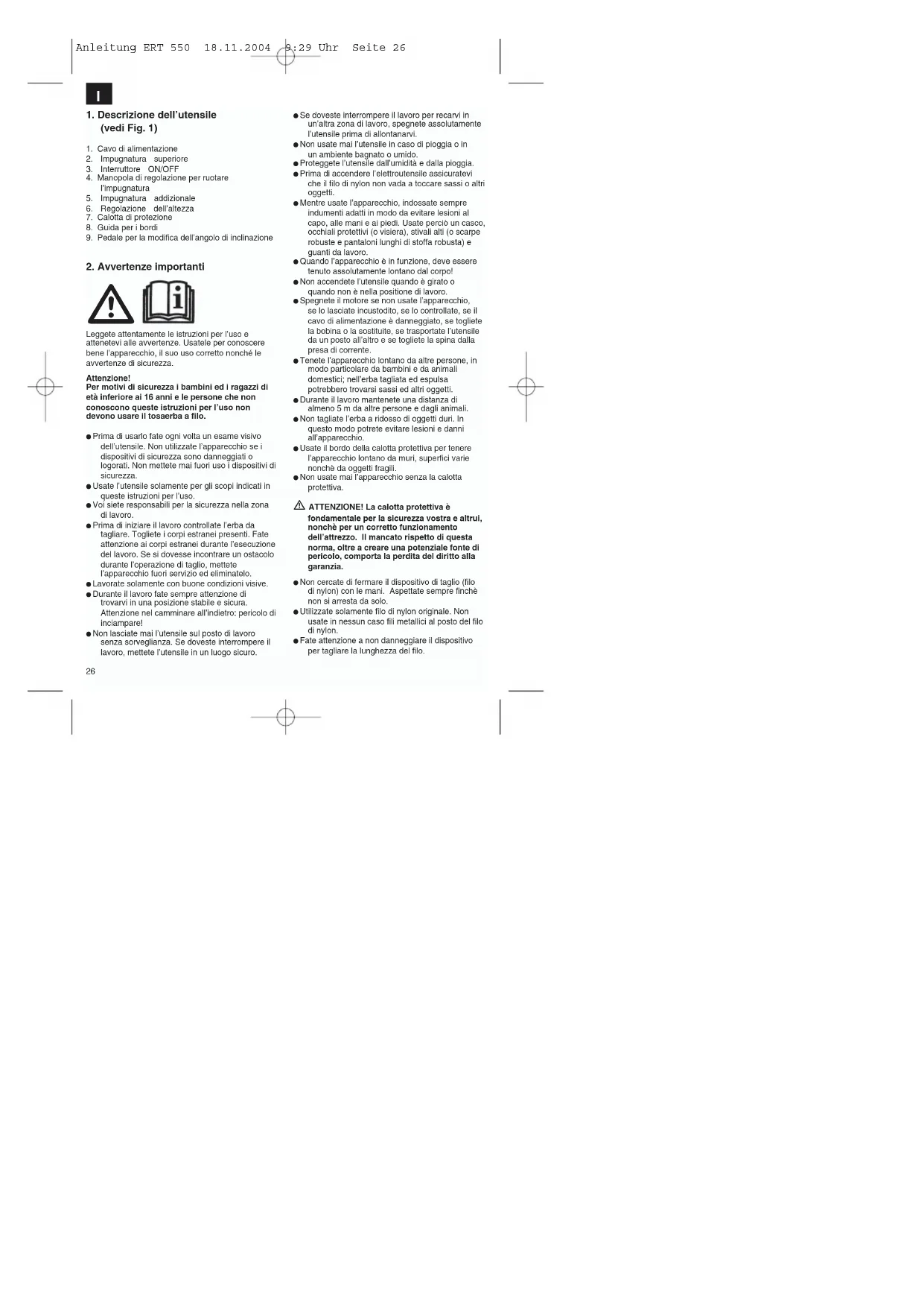 Anleitung ERT 550 18.11.2004 9:29 Uhr Seite 26 Fate attenzione che le fessure d’areazione siano libere da sporco. Dopo l’utilizzo staccate la spina dalla presa di corrente e controllate che l’attrezzo non abbia subito danni. Non cercate di tagliare l’erba che non cresca sul terreno; non cercate ad esempio di tagliare l’erba che cresce su muri o sassi, ecc. Nella zona d’impiego del tosaerba, l’utilizzatore è responsabile di danni derivati a terzi dall’uso dell’apparecchio. Non attraversate strade o vialetti di ghiaia con l’apparecchio acceso. Quando non usate l’apparecchio conservatelo in un luogo asciutto e non accessibile ai bambini. Usate l’utensile solo nel modo in cui è descritto nelle istruzioni per l’uso e tenetelo sempre verticale al terreno. Qualsiasi altra posizione è pericolosa. Controllate regolarmente che le viti siano avvitate correttamente. La tensione di rete deve corrispondere a quella indicata sulla targhetta di identificazione. Controllate regolarmente che il cavo di collegamento non presenti danni o segni di deterioramento. L’apparecchio non dev’essere usato se il cavo di collegamento non è in perfetto stato. I cavi di collegamento usati non devono essere più leggeri dei cavi in guaina di gomma H07RN- F, secondo la norma DIN 57282/VDE 0282, e devono avere una sezione minima di 1,5 mm2. Gli allacciamenti a spina devono avere contatti di terra e gli attacchi devono essere protetti dagli spruzzi d’acqua. Tenere la superficie da tagliare sempre libera da cavi ed altri oggetti. Se l’apparecchio deve venir sollevato per il trasporto, spegnete il motore ed attendete che il filo abbia smesso di ruotare. Prima di allontanarsi dall’apparecchio spegnete il motore e staccate la spina dalla presa di corrente. Prima di inserire la spina di alimentazione, assicuratevi che gli elementi rotanti non siano danneggiati e che la bobina del filo sia inserita correttamente e ben fissata. Il funzionamento dell’apparecchio non è in nessun caso concepito per tagliare a ridosso di oggetti duri; solo così si possono evitare lesioni a chi lo usa e danni all’apparecchio. Per le riparazioni usate solo ricambi originali. Le riparazioni devono venire eseguite solo da un tecnico elettricista. Prima della messa in esercizio della macchina e dopo qualsiasi collisione controllate che non ci siano segni di usura o danni e fate eseguire le riparazione necessarie. Tenete mani e piedi sempre lontani dal dispositivo di taglio, soprattutto quando accendete il motore. Dopo aver estratto un filo nuovo, tenete la macchina sempre nella posizione di lavoro normale prima che venga acceso. Non usate mai ricambi ed accessori che non sono previsti o consigliati dal produttore. Togliete la spina dalla presa di corrente prima di eseguire controlli, pulizie o operazioni alla macchina e quando questa non è in uso. Atenzione: dopo aver spento il motore, il filo di nylon continua a ruotare per alcuni secondi!