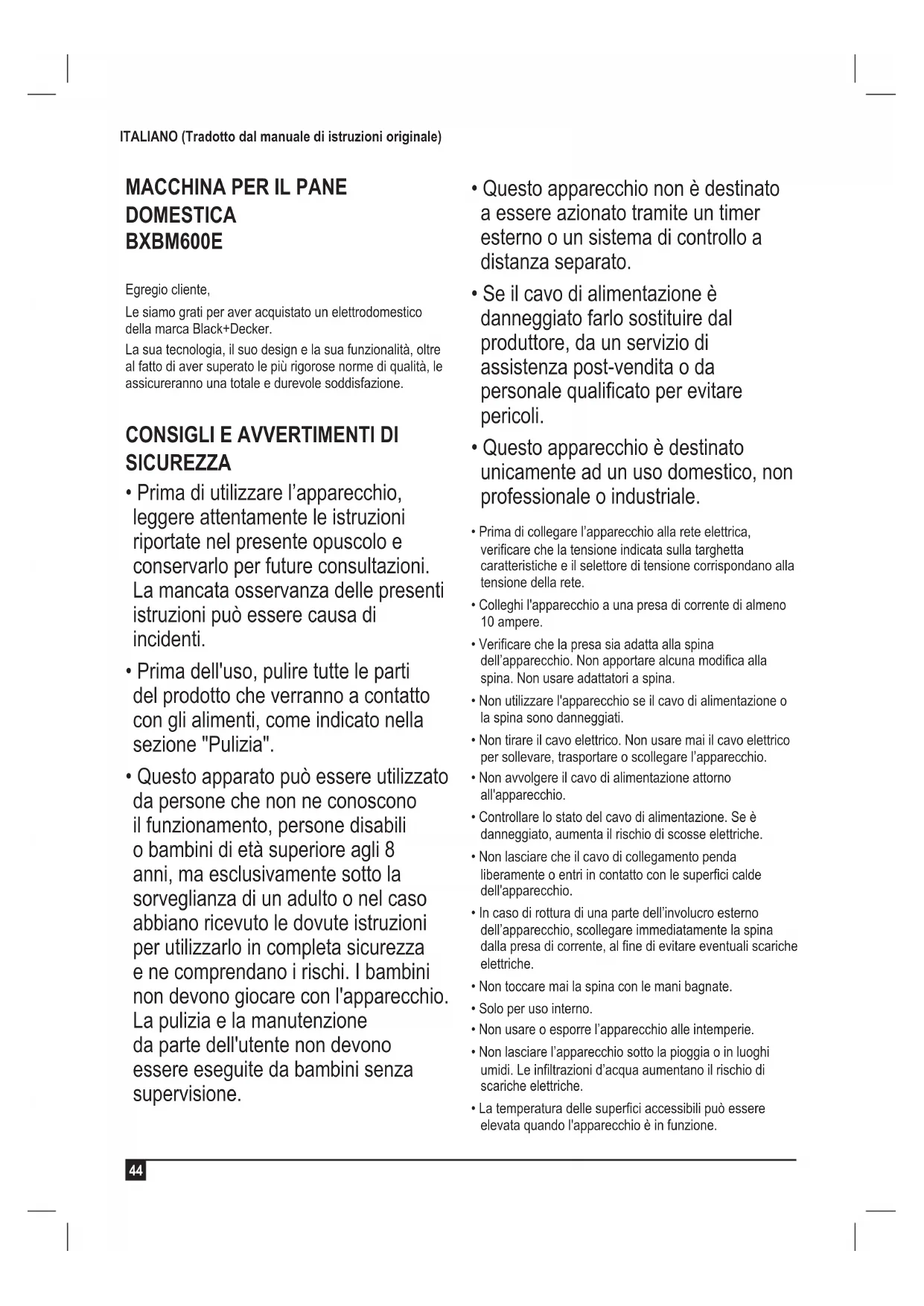 DOMESTICA BXBM600E Egregio cliente, Le siamo grati per aver acquistato un elettrodomestico della marca Black+Decker. La sua tecnologia, il suo design e la sua funzionalità, oltre al fatto di aver superato le più rigorose norme di qualità, le assicureranno una totale e durevole soddisfazione.