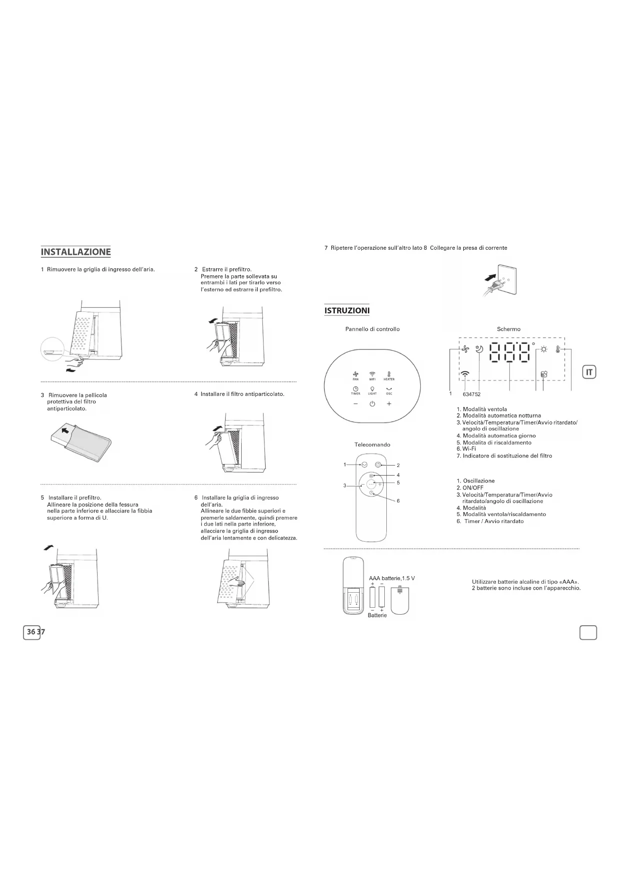 - Premere + o - per passare alla modalità manuale. La temperatura di esercizio massima è 35 °C. Premere per impostare manualmente la velocità della ventola, la temperatura di riscaldamento target, l’angolo di oscillazione, il timer e l’avvio ritardato. Premere per attivare o disattivare la funzione di oscillazione. Quindi premere + o - per selezionare l’angolo desiderato (30° - 60° - 90°). Ripristino del filtro : tenere premuto (5 secondi) per reimpostare il filtro. Il segnale acustico indica che la reimpostazione è stata completata. Timer : premere una volta per attivare il timer. Quindi premere + o - per programmare lo spegnimento automatico da 1 ora a 12 ore. Avvio ritardato : quando l’apparecchio è spento, premere il pulsante per programmare. l’avvio ritardato; quindi, premere + o - per accenderlo da 1 ora a 12 ore più tardi. Ripristino del timer : tenere premuto (5 secondi) per arrestare il timer prima del completamento. In modalità ventola: la spia è un indicatore della qualità dell’aria (indice a 5 colori che varia dal blu al rosso a seconda del livello di inquinamento della stanza). In modalità riscaldamento : la spia è sempre rossa. In entrambe le modalità, premere due volte per spegnere la spia. NB: al primo utilizzo, per impostazione predefinita il prodotto ha attiva la funzione ventola in modalità automatica. Una volta collegato alla presa di corrente, il prodotto salva l’ultima modalità utilizzata. Importante: in modalità standby il prodotto mostra « o » sullo schermo. AVVERTENZA - Non coprire mai l’apparecchio, poiché potrebbe surriscaldarsi sia in modalità di riscaldamento che in modalità ventola. - In caso di surriscaldamento, spegnere e scollegare l’apparecchio per lasciarlo raffreddare. - Una volta raffreddato, è possibile ricollegarlo e utilizzarlo nuovamente.40 41