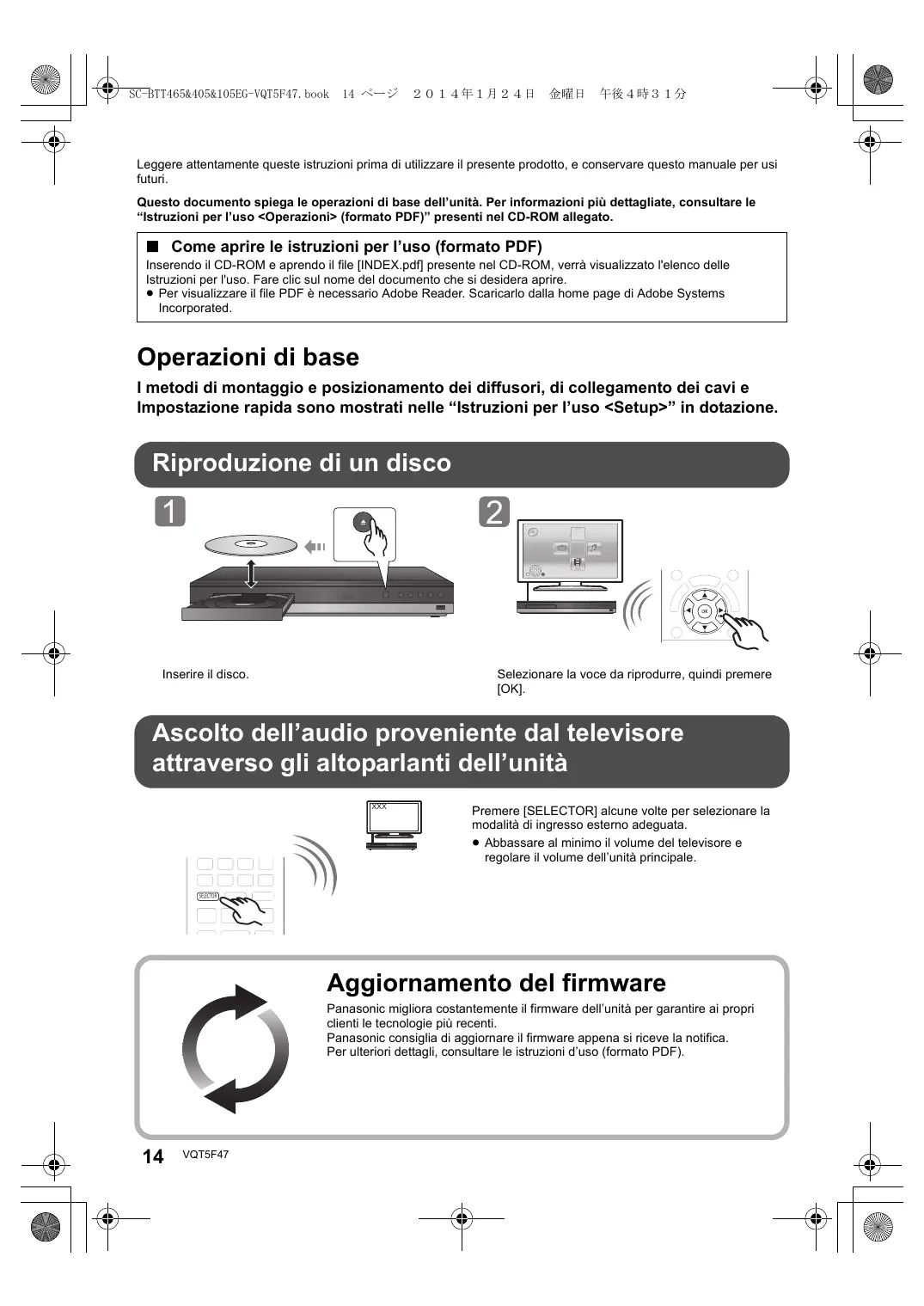Leggere attentamente queste istruzioni prima di utilizzare il presente prodotto, e conservare questo manuale per usi futuri. Questo documento spiega le operazioni di base dell’unità. Per informazioni più dettagliate, consultare le “Istruzioni per l’uso <Operazioni> (formato PDF)” presenti nel CD-ROM allegato. ∫ Come aprire le istruzioni per l’uso (formato PDF) Inserendo il CD-ROM e aprendo il file [INDEX.pdf] presente nel CD-ROM, verrà visualizzato l'elenco delle Istruzioni per l'uso. Fare clic sul nome del documento che si desidera aprire. ≥ Per visualizzare il file PDF è necessario Adobe Reader. Scaricarlo dalla home page di Adobe Systems Incorporated. Operazioni di base I metodi di montaggio e posizionamento dei diffusori, di collegamento dei cavi e Impostazione rapida sono mostrati nelle “Istruzioni per l’uso <Setup>” in dotazione. Riproduzione di un disco